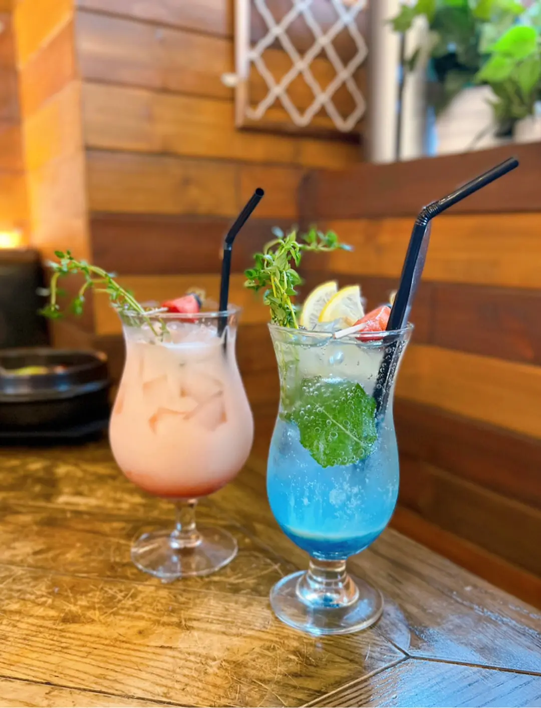 草莓生米酒(左)& 白桃藍柑荔枝梳打(右)