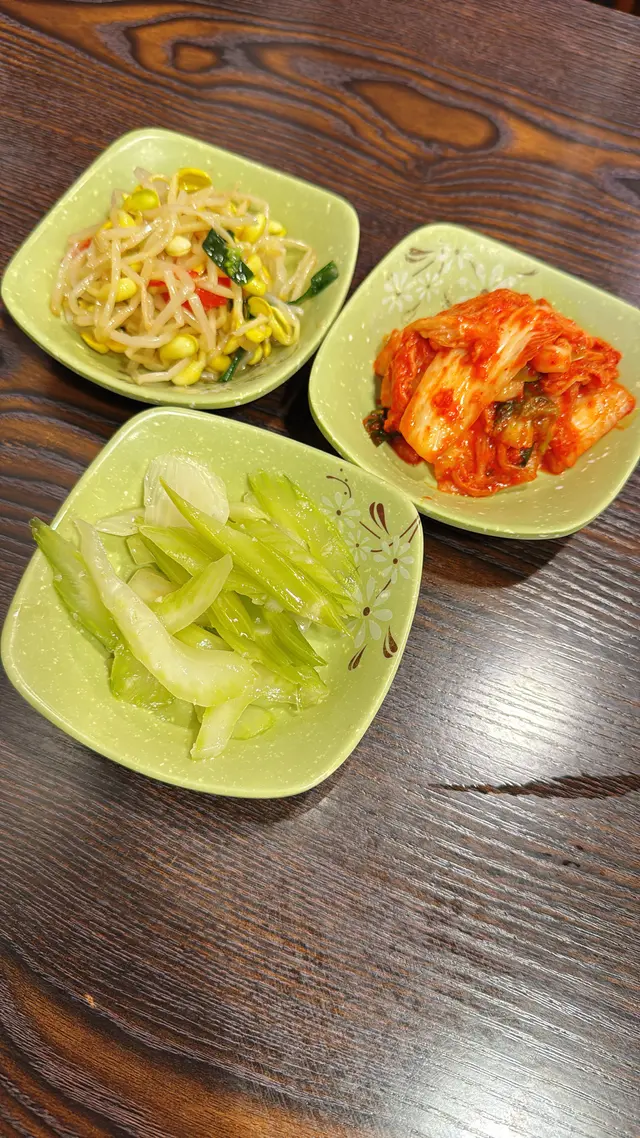 。點餐後,店員會奉上前菜,共有3款:白菜泡菜、芽菜和四季豆。