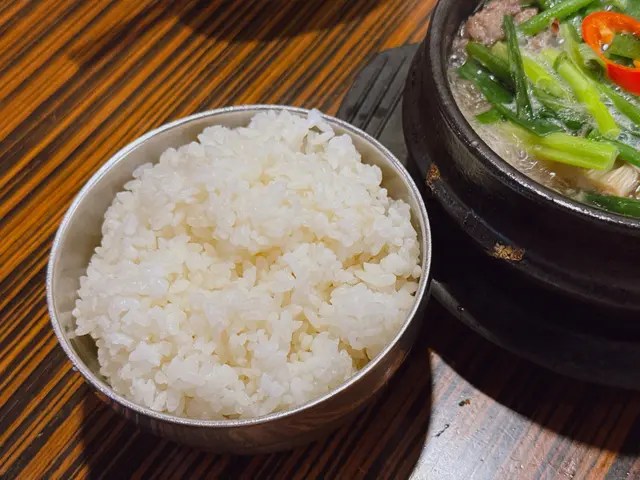 這一鍋湯飯非常足料!鍋內放了原隻童子雞,雞殼內再藏有米飯、蒜頭等食材。糯米飯早已燉至軟爛。雞髀位置的肉質相對嫩滑