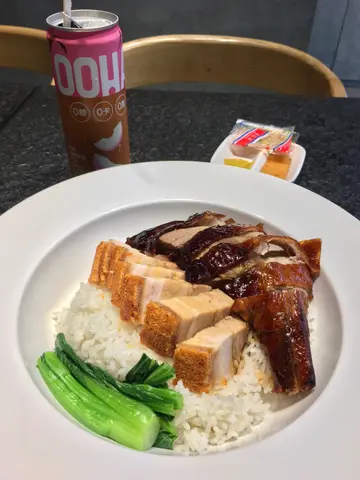 燒味飯唔係淨係男士先鍾意,好多港女都鍾意食㗎,今日晏咗食lunch,所以比較肚餓,就想去食碟雙拼飯啦,遇著下午茶時間(14:00-17:59),又平多少少。雙拼燒味飯 $45燒腩仔估唔到塊皮超脆,脆過威化餅,肥瘦適中,充滿油香燒鵝 +$10OOHA白桃烏龍 +$6平時食開嘅燒味舖,一般都係有例湯或紙包飲品,呢度多啲選擇,比較少見嘅紅棗茶丶蘋果茶。今日熱熱地,我就揀咗OOHA,降溫順便解膩,爽!獨立包裝嘅醬料,感覺上乾淨啲,同埋需要時先拆,唔使浪費