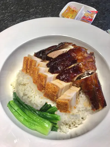 周末黎到呢間燒味店食下午茶,下午茶時段更優惠。呢到好近地鐵站,係一間小學隔離,平時經過都見多人幫襯,所以趁有機會就試下。店舖裝修好新派,座位都算多。以燒味店黎講,食物都算多選擇,除左飯之外,仲有瀨粉同河粉,另外加錢仲可以轉烏冬或出前一丁。我叫左雙拼飯,油雞拼燒腩仔,另外仲叫左杯蜂蜜蘋果茶。可以見到油雞雞皮下薄薄既脂肪,食落滑嫩,口感鬆軟。我覺得燒腩仔可以睇得出一間燒味店既功架,呢到既燒腩仔好好食,皮脆肉嫩,肉同脂肪層次分明。除左油雞同燒腩仔,仲有薑蔥同芥醬,分別沾上,味道更好更惹味。菜心雖然唔係主角,但同樣新鮮幼嫩。蜂蜜蘋果茶幾特別,入面有細細粒既蘋果肉,味道清甜。