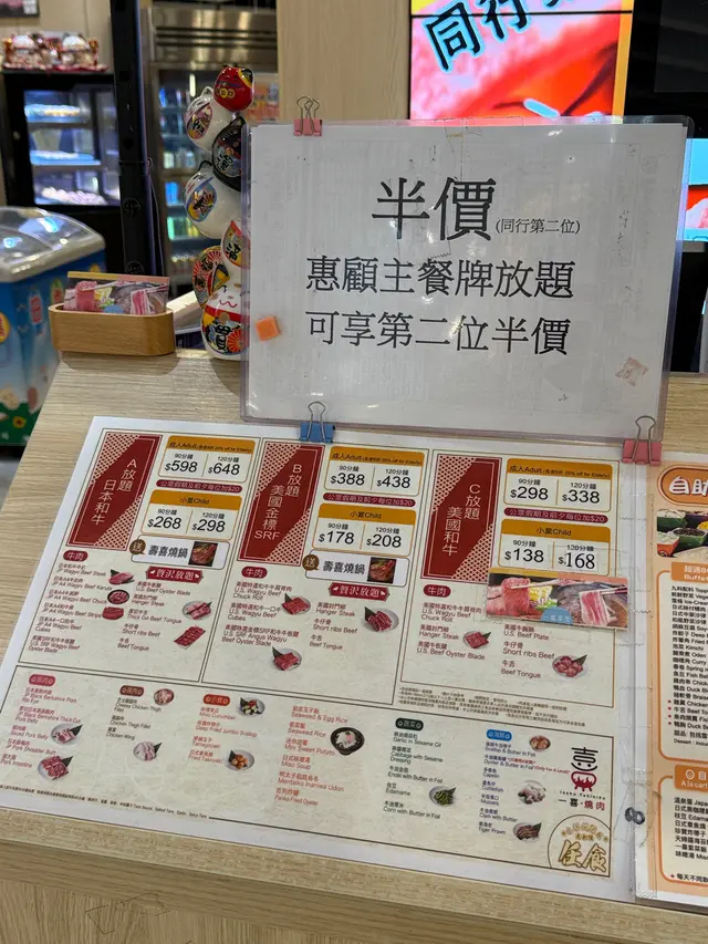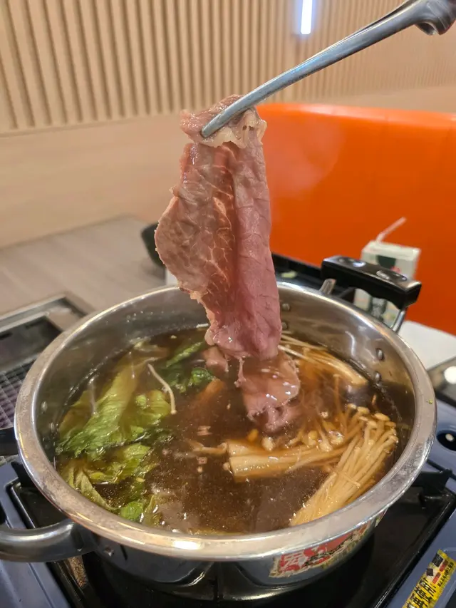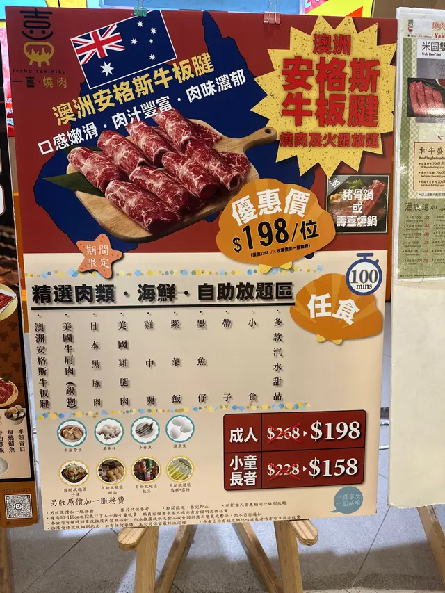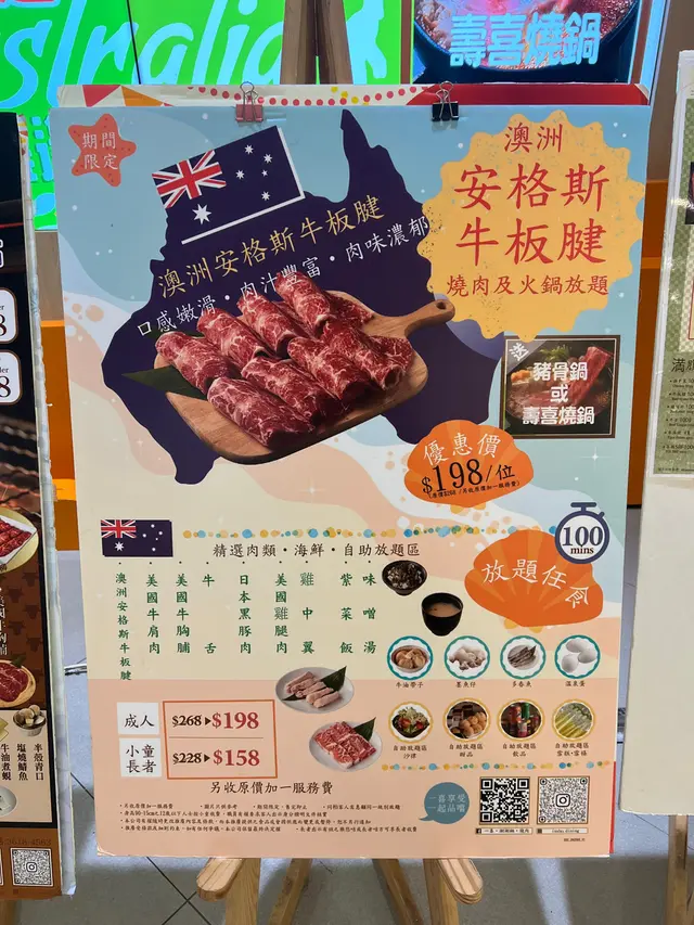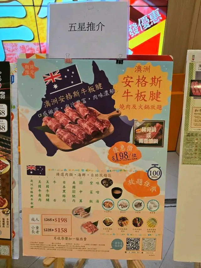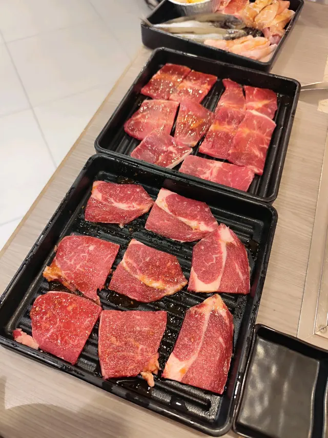 今次同朋友食去商場食日式燒肉放題,一般會食美國金標SRF,呢種中價位嘅餐,日本和牛都試過。不過今次揀左最平最少選擇嘅澳洲安格斯牛板腱燒肉放題,優惠價$198,連加一只要$225,確實幾抵。不過原來除左平,仲有其他好處:牛板腱位於肩胛內側,肉質結實但有細緻的肌纖維,食落落有咬口,唔會太軟。而脂肪唔多但分佈均勻,中間又有一條嫩筋,燒烤時既有肉香又唔會太油膩,食落juicy,口感有層次,唔會食幾塊就膩。燒肉以外,我地入座,仲附上一個豬骨湯底火鍋,燒肉之前先食菜。火鍋湯底清淡,勝在可以補充各種蔬菜,同試下薄切牛肉喺清淡湯底入面,點突出牛味同口感。除左金菇之外,食完嘅蔬菜都可以出去自助區補充,令營養更均衡。正式食燒肉,發現豬牛雞都有,有原味、燒肉汁、塩鹽、蒜香同辛味醬汁。牛肉方面更加除左牛板腱之外,仲有牛肩肉同薄切牛舌。- 牛板腱:結實但有嚼勁,脂肪唔多但分佈均勻,嫩筋增添口感層次,適合原味、蒜香、辛味醬汁等 keep 肉味嘅醬汁,係穩定表現嘅熱門選擇。- 牛肩肉:通常較瘦但風味濃郁,口感會比板腱鬆少少,但同樣容易煎到多種熟度,較易吸收醬汁嘅香氣,所以我主要食原味。- 薄切牛舌:口感獨特,薄片易入口,肉味濃但脂肪少,煎得適中就會有脆嫩感,今次無韌,適合喜歡牛味但不想太厚重嘅食客。而豬肉係黑豚腩肉,雞肉係去骨雞腿同雞中翼,雞翼平時食得太多所以今次無叫- 黑豚腩肉:脂肪含量豐富、油脂香氣突出,所以我地燒耐啲,等佢有少少焦香。- 去骨雞腿:較多汁,味道清淡,作為中和其他部位嘅選擇,我地都叫左少少。牛油帶子一份比較多,但比較細隻,牛油香味搭救,而墨魚仔比較中規中矩。醬料區非常豐富飲品甜品都好豐富,除左一般常見汽水之外,都有部分韓國罐裝飲品。甜品蛋糕泡芙一應俱全,雖然雪糕牌子係任食火鍋常見CoCoBerry ,不過雪條有明治兩款口味,選擇唔算超多,不過滿足肉食以外其他需要,都算夠。…查看更多