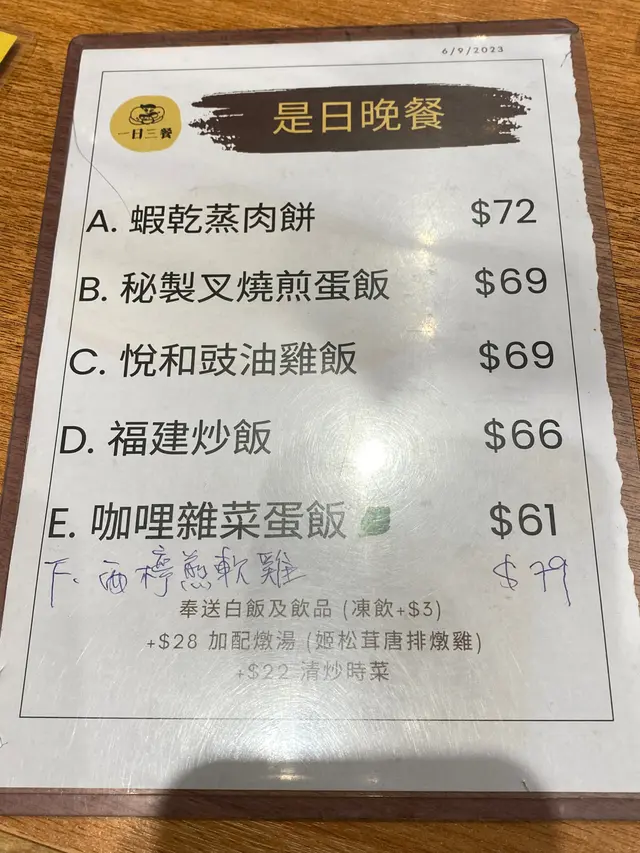 嚟到一日三餐悅和豉油雞一定係必點既豉油雞飯($69)睇餐牌價錢偏貴少少,不過實物份量好足,都ok。係鹹味比甜味重既豉油雞,豉油味好香,比左雞脾位,雞肉好滑,雞皮唔會太冧,依然彈牙。唔會話好食到空前絕後,但值得一試。乾炒牛河($66)味道普通,油份多,入口油味比香味重,無乜豉油味,牛肉亦都比較韌。見到有人推介乾炒牛河,但只係普通貨色,呢個質素黎講好貴。賞花杏仁露(跟餐$6)嚟得一定要叫嚟打卡,不過我呢杯花瓣唔夠多,而且開得比較稀,但味道係合格既,可以試下。Read More