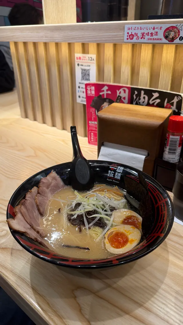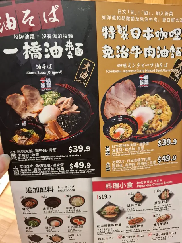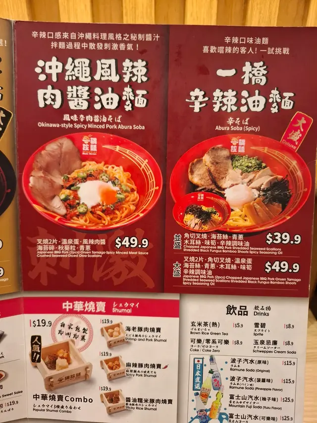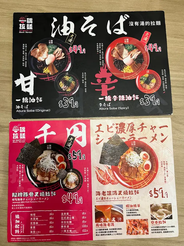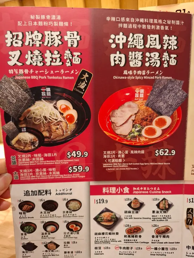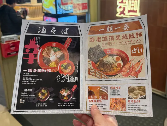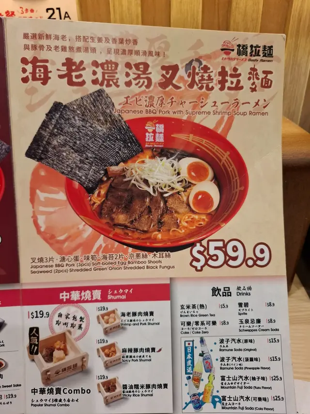 肚餓了,要覓食。這家拉麵店,竟然無需排隊,可馬上人座,所以在此晚餐。手機下單,手機付款,才算成功下單落ORDER。海老濃湯叉燒拉麵 餐牌描述了成份&配料。 湯底:新鮮蝦&生薑&香葉炒香,用豬骨&老雞煮出來。配料:叉燒3片溏心蛋味筍海苔2片,京蔥絲木耳視覺: 幼身拉麵完全浸在橙色的湯裡,只露出紫菜及京蔥絲。 嗅覺:只有淡淡的蝦香。 手感:以筷子在湯底裡夾出各配料,拉麵份量不多,没有壓至一餅餅,容易夾出麵條。口感:幼身拉麵口感煙韌不彈牙,容易咬。叉燒肉多肥膏少,口感實在,起碼不太肥但要比時間多咬几下。味道:蝦湯帶辣,有淡淡蝦香,似檳城蝦麵,但蝦香卻没有檳城蝦麵那般濃。 幼身拉麵易掛汁,把拉麵放在湯匙裡,可以同時享受麵和湯。幼身拉麵梘水味不明顯。中華燒賣COMBO有3款燒賣:醬油糯米豚內燒賣 糯米帶甜為主,夾雜肉碎。 海老豚肉燒賣 味道接近飲早茶的籠籠燒賣。麻辣豚肉燒賣 麻辣明顯,但不算太辣。一穚辛辣油麵 朋友點了大盛,附溫泉蛋。原來辛辣調味油在碗底,要先拌勻, 再慢慢享用。偷嚐一口,只是辣度&鹹度比蝦麵高一點,但没有噴火的感覺。…查看更多