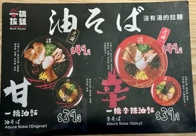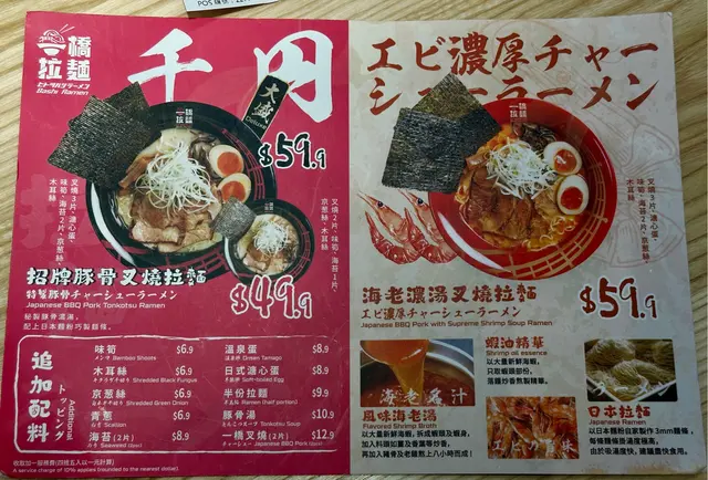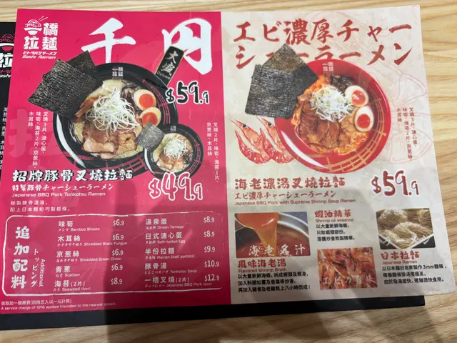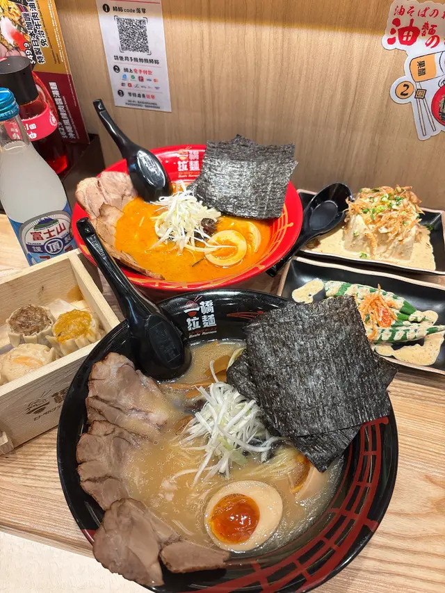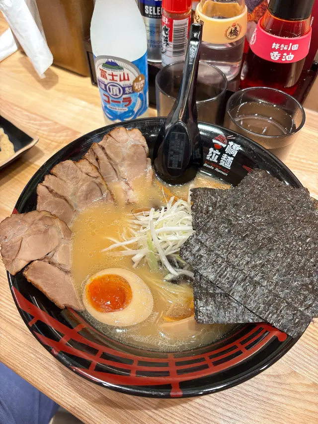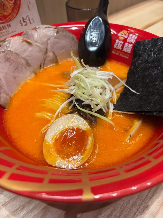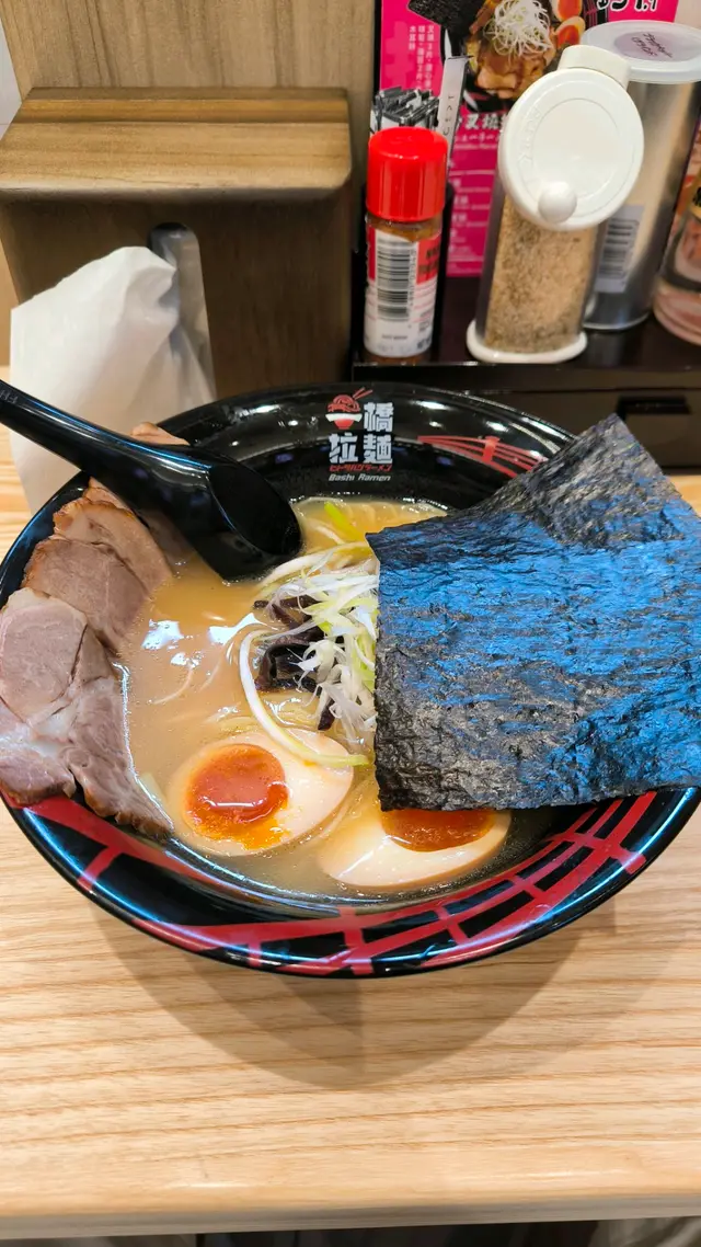 二人餐失望之選放工突然好想食拉麵,見到新開張,抱住試新嘢嘅心態,我哋喺荃新天地試咗一橋拉麵嘅二人餐($138),結果幾失望。🍜 招牌豚骨叉燒拉麵:湯底唔夠濃郁,叉燒冇咩味,冇蛋已經扣分,拉麵亦唔夠彈牙,整體冇驚喜。🌶️ 海老濃湯叉燒拉麵:味道偏辣,但餐牌完全冇標示,對唔食辣嘅人嚟講真係唔太友善。配菜小食都係一般,冇特別。以差唔多價錢,荃新天地另一間拉麵明顯好食好多。整體食物質素非常一般,唔會再回頭。…查看更多