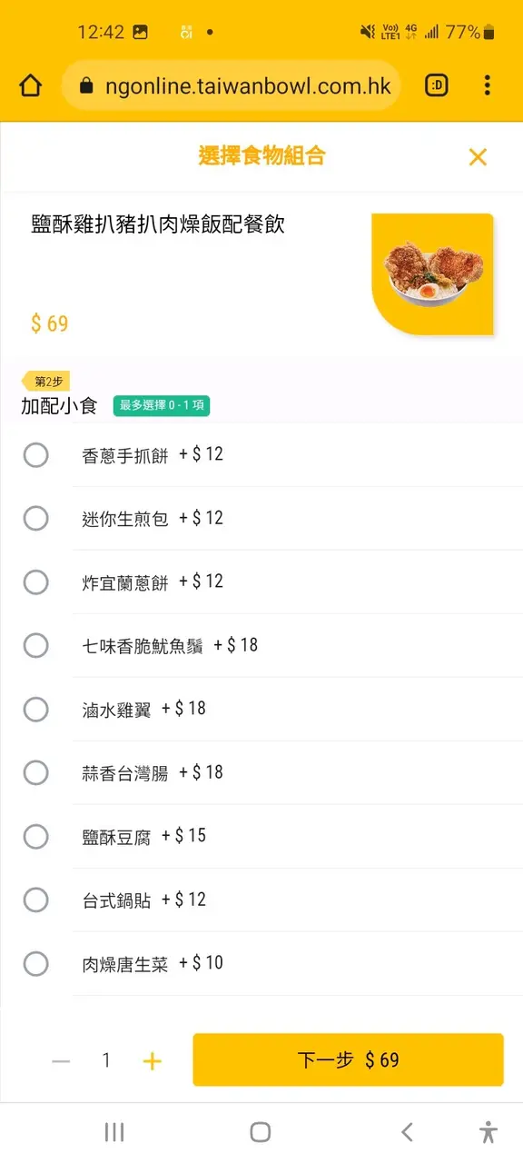 上星期,舊男同事DN約我今日(10-3-2025 Mon)食晏,咁我唔帶飯啦,點知佢今朝突然話改聽日,咁改啦。於是今日我要自己食街外嘢,食邊間好呢?盔匠(https://www.openrice.com/zh/hongkong/r-%E7%9B%94%E5%8C%A0-%E6%B2%99%E7%94%B0-%E5%A4%9A%E5%9C%8B%E8%8F%9C-r807404)嘅燒餅?都係唔好喇,要買返公司食,呢間啦,其實想試好耐,奈何之前有同事話佢好油,有同事覺得唔好坐,所以一直都冇食過,咁趁今日自己食,就嚟呢間。我早啲嚟,嚟到時都冇乜人,店員叫我坐單邊位同掃QR code落單,都有好多選擇,最後我揀咗$69.00嘅鹽酥雞扒豬扒肉燥飯配餐飲,加$7.00轉原味肉燥湯新竹米粉,飲熱桂花薏米水。落完單,好快,食物就到嚟,睇見鹽酥雞扒豬扒份量好多,原味肉燥湯新竹米粉有半隻溏心滷水蛋,原味肉燥同酸菜。先食新竹米粉,佢係正常幼身,口感腍咗少少,湯就唔知咩湯,我唔識形容,但唔會難食;原味肉燥同酸菜唔多,肉燥唔算好肥,但我竟然食到有骨;酸菜正常,但又係份量太少,唔係好解到膩;半隻溏心滷水蛋夠味嘅。3.25分睇睇鹽酥雙扒,右邊應該係雞扒,左邊係豬扒,兩隻都炸到外脆內裡juicy,但雞扒食到似解唔夠凍嘅雪藏嗰陣膻味,係皮下脂肪太厚嘅緣故? 4分豬扒都係鬆軟juicy,都見到脂肪部份好似佔咗一半,所以都覺得膩,而椒鹽味都幾夠嘅,不過見到啲肉帶粉紅色,而睇咗其他食評,有人反映過,但店員話係正常,我諗,我講嚟都冇用,就算真係生蟲,都冇證據話係佢,自求多福。3.5分至於杯熱桂花薏米水呢?味道淡又唔熱,淡到根本唔知自己飲緊乜,但見到有好多腍薏米。0.3分我覺得嘢食嘅份量比例唔好,餸多米粉少,而且餸嘅份量,足夠二人同食,最後我要俾$1.00用外賣盒拎走食唔晒嘅雙扒。建議調節返份量同價錢,餐飲只係冷/熱熱桂花薏米水免費,其他,就連普通嘅奶茶,檸水都要加$3.00。抵食係2.6分題外話:我落完單,繼續睇佢哋menu,至發覺原來有類似車仔麵嘅模式,可以自己揀要飯,米粉等等,要咩餸菜,不過我今次第一次嚟,都係試咗經典台灣嘢食先。 …查看更多
