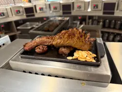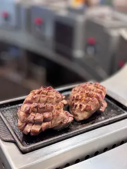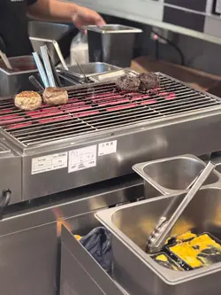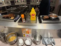 枱上的醬汁包括燒肉醬汁、辣油及芥辣,相信是配漢堡扒的。但那芝麻醬汁,樽口細細,很難倒出醬汁內的芝麻,有點可惜。之後再來前菜,筆者選擇了靖魚店員煎好漢堡扒後,便放在熱板上存熱⋯⋯筆者試過用燒肉醬汁及芥辣配都好味。
