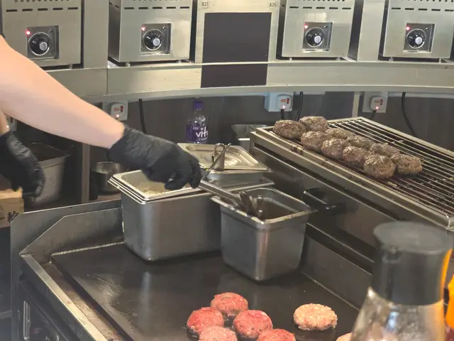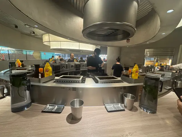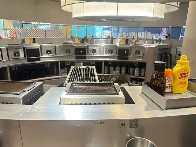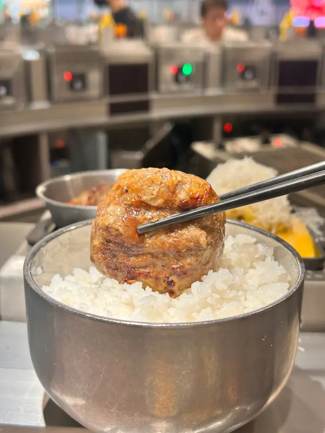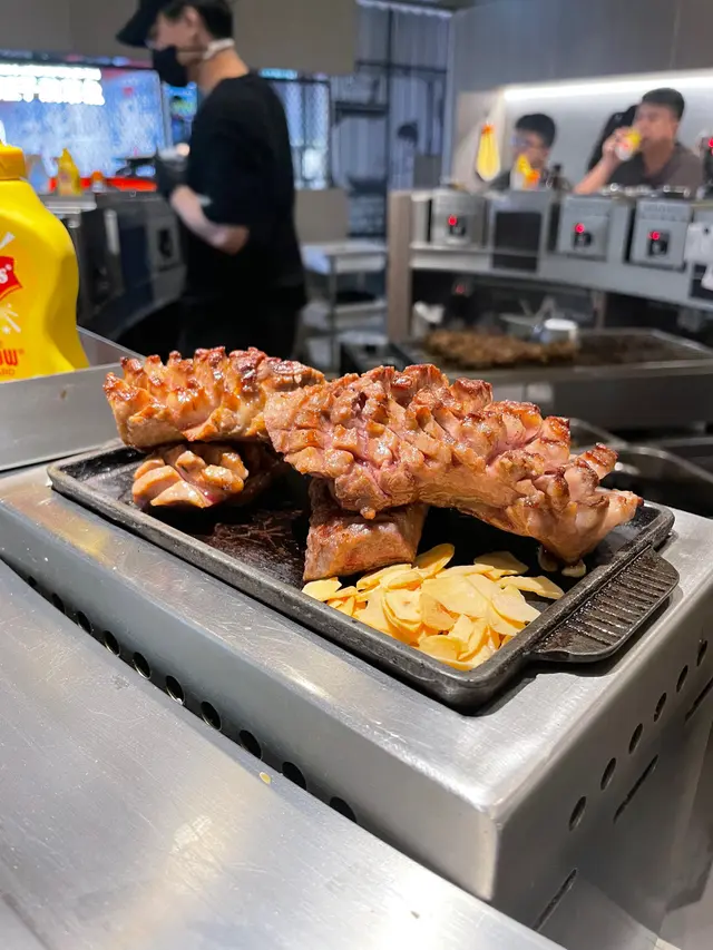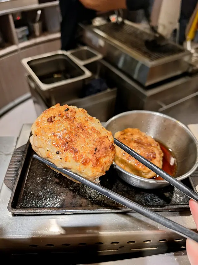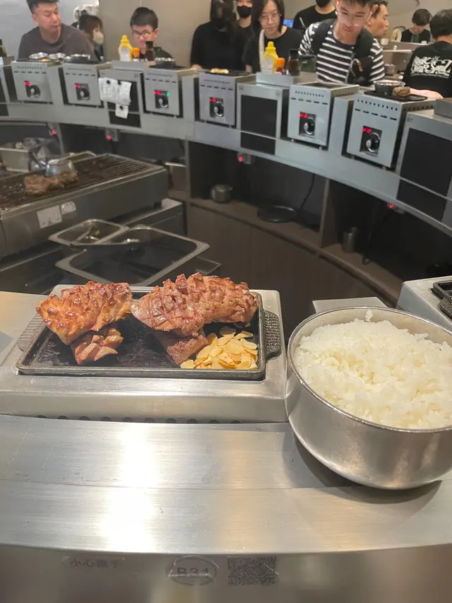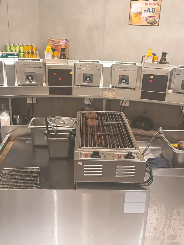 枱上的醬汁包括燒肉醬汁、辣油及芥辣,相信是配漢堡扒的。但那芝麻醬汁,樽口細細,很難倒出醬汁內的芝麻,有點可惜。之後再來前菜,筆者選擇了靖魚店員煎好漢堡扒後,便放在熱板上存熱⋯⋯筆者試過用燒肉醬汁及芥辣配都好味。