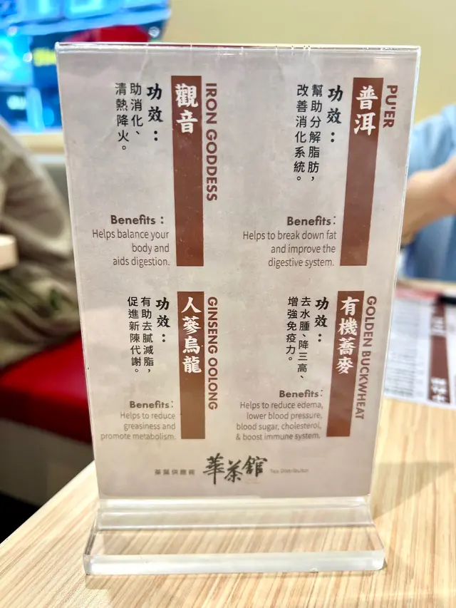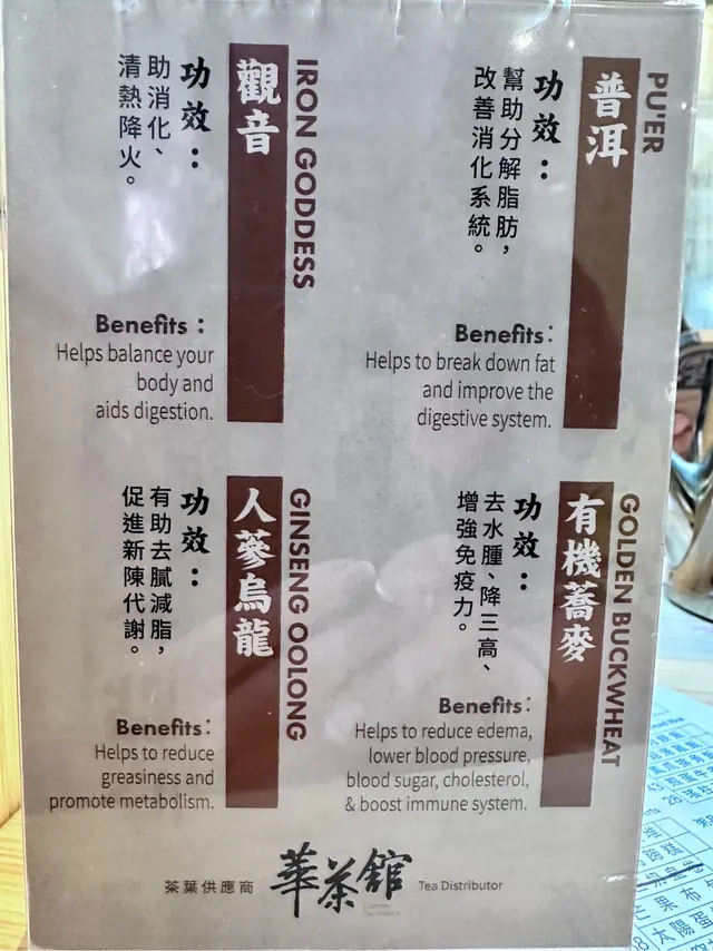 茶有四款可以揀每種茶都註明功效,非常貼心。我揀咗出邊少有的人蔘烏龍,甘甘地飲落幾舒服。功效有助去膩減脂,促進新陳代謝。