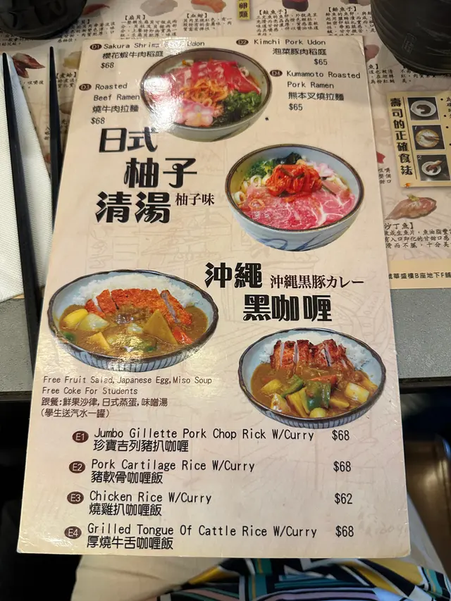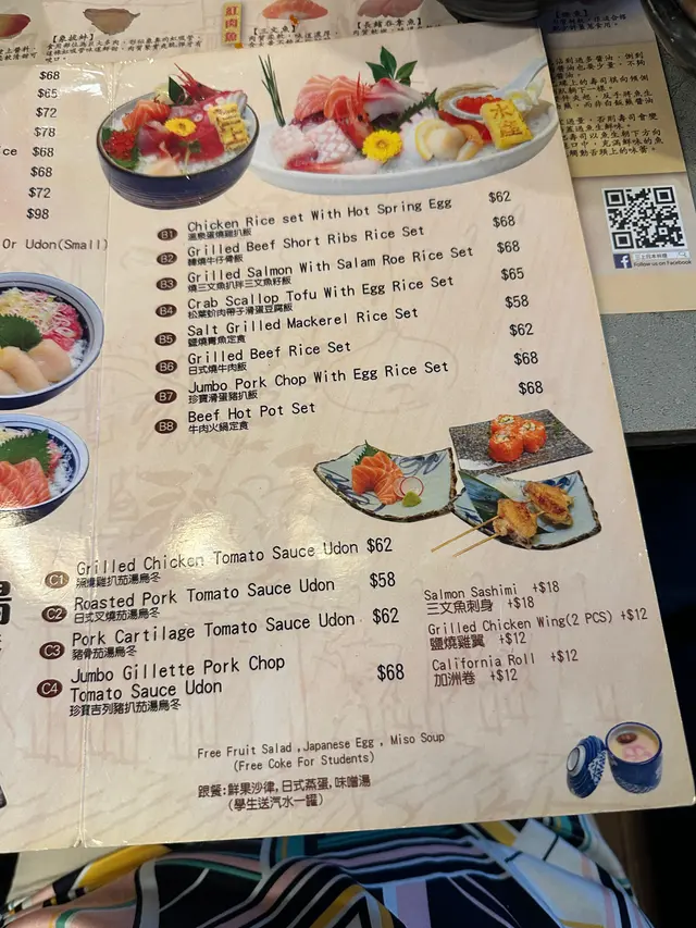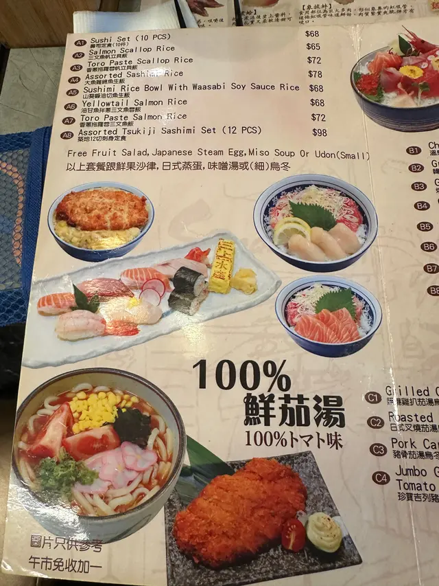 《CP值高質日本餐廳》今日是一號風球,正當外出工作遇上大雨滂沱,正想避雨之際,無意中經過門口順便看看午餐🍱,睇到午餐餐牌精選選擇很多(魚生飯、雜錦番茄烏東、壽司定食、咖喱飯、叉燒拉麵…等,價錢實惠。內部裝修像是有些年份的普通的日式居酒屋,不過乾淨企理,坐位舒適。對面的食客叫了一客雜錦天婦羅 ;旁邊的食客叫了一份雜錦刺身配蕎麥麵(用鵪鶉蛋)拌麵,感覺很新鮮,下次也想試試。今日先試吓壽司飯定食($68,未加一),因為set A1,通常都係受歡迎的。試食之後覺得味道正宗,猶如置身日本旅行的小店,感到驚喜大滿足。謝謝 !謝謝 !謝謝 ! 這樣美好的偶遇!下次會試日本蠔咖喱飯或者天婦羅😋