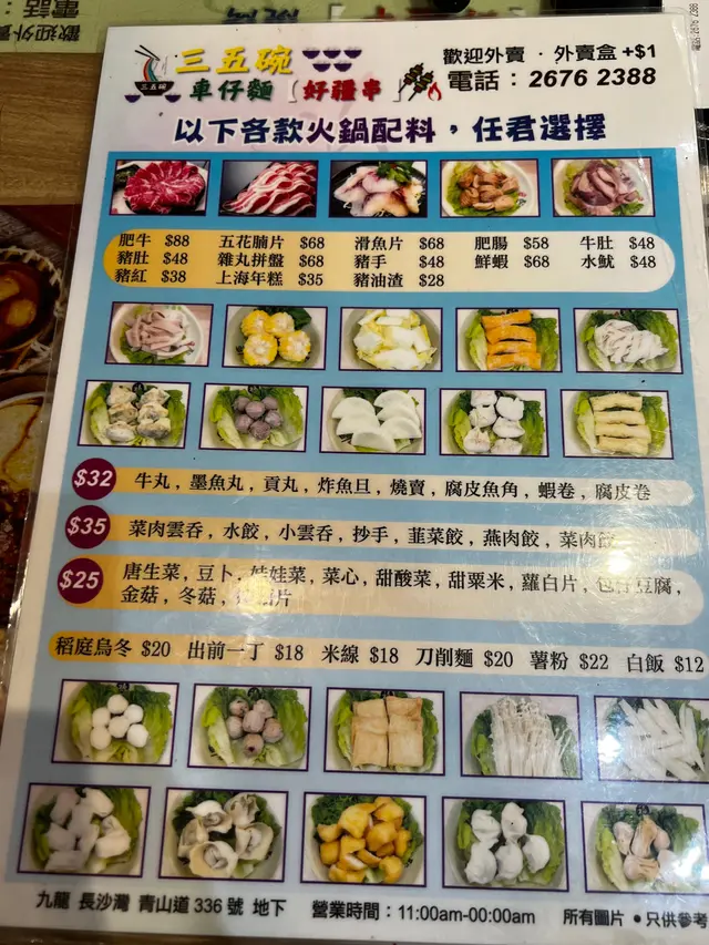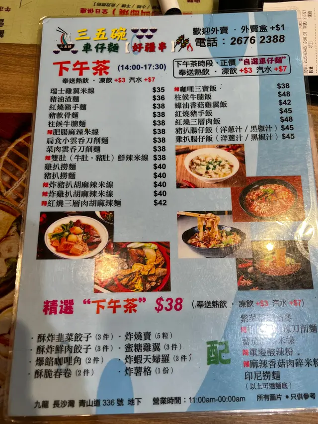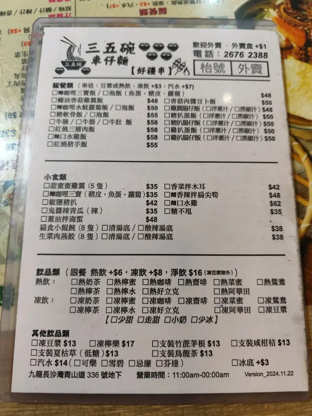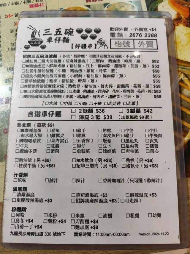 三五碗車仔麵 (長沙灣) 網址: https://s.openrice.com/QrbS0MtuD00 地址: 香港長沙灣青山道336號地舖 電話: +852 26762388