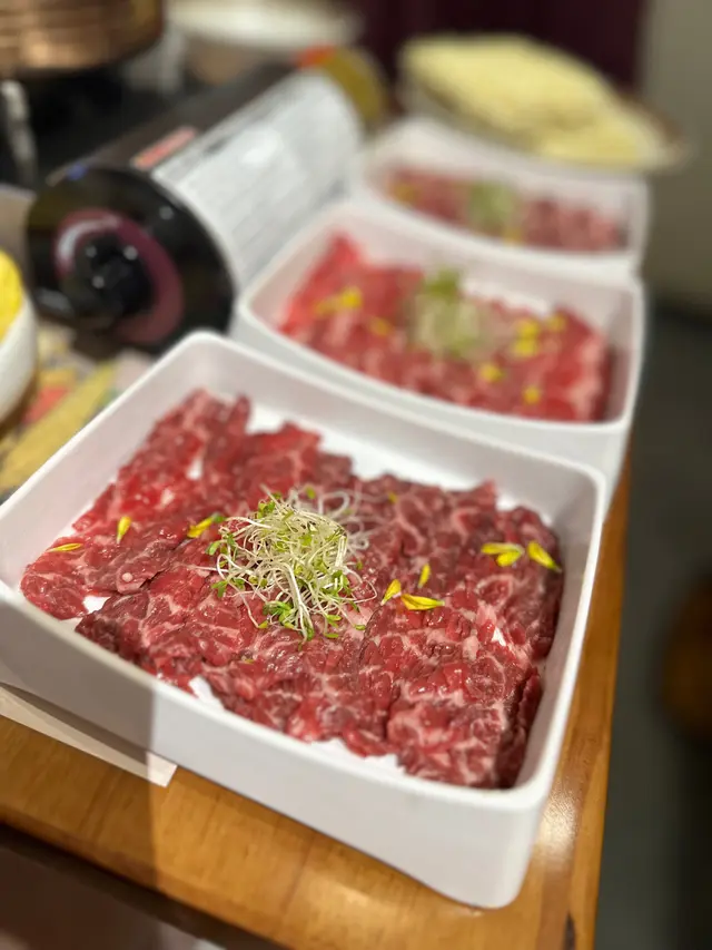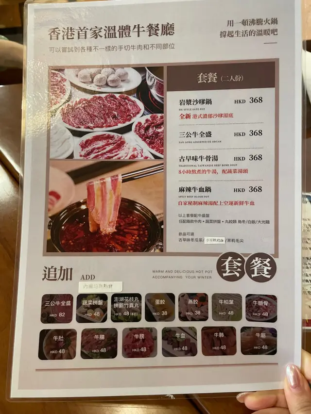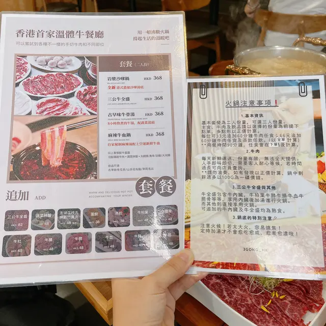 沙嗲岩漿火鍋 Koey.hsu等級42024-06-11223 瀏覽 關注 香港首家溫體牛餐廳自從喺台灣食過溫體牛之後,一直對佢念念不忘,估唔到依家喺香港都係食到。最近喺旺角開設咗香港首家溫體牛餐廳,等我即刻試吓有咩唔同先。佢哋啲牛肉每日都係新鮮運送,所以數量有限㗎,全部都係即叫即切,限量供應食晒就冇㗎啦。岩漿沙嗲鍋聽個名都知道夠晒氣勢,其實就係港式濃郁嘅沙嗲湯底,味道唔會好辣,充滿沙嗲嘅香味。我就試左三款牛肉:牛頸脊、牛菲力和牛嫩肉。我自己就最鍾意牛頸脊,充滿油花嘅同時亦都保留咗牛肉嘅味道。另外飲品方面選擇都好多,我就揀咗兩款手搖飲品百香果愛玉果子和青檸愛玉冬瓜。如果唔夠食嘅朋友,可以用$33升級做任食60分鐘,啱晒肉食獸。三公台灣料理 (旺角)旺角西洋菜南街2T號添置商業中心1樓加$33可以任食60分鐘…查看更多+ 3以上食評乃用戶個人意見 , 並不代表OpenRice之觀點。讚好分享沙嗲岩漿火鍋 三公台灣料理 https://s.openrice.com/QrbT0gnXK00檢舉 張貼 評分5味道5環境5服務5衛生5抵食用餐途徑堂食