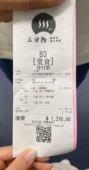 旅行結束返香港,把握放假嘅尾巴,黎北角三分熟鐵板燒。炭火料理,嘆番個味覺嚮宴先同老公午市黎到,一人嗌左個[媄]一人前,$5981️⃣先付一田園野菜沙律三色車厘茄柚子胡麻醬提升酸度,個醬汁真係勁香!2️⃣熱一水野茶碗蒸蟹肉魚翅茶碗蒸啖啖蟹肉鮮味,簡單海苔粉調出味道蛋味香濃,質感幼滑3️⃣荀一北海道帆立貝伴毛豆あん賣相吸引,香氣十足煎香外層,入面保留半生熟口感,火候恰到好處,入口即溶,好味👍🏻順帶要讚搭配的忌廉汁因為加左日本冬瓜莎莎,令帆立貝入口感覺更清爽4️⃣炭 一稻草鰹魚伴黑蒜油醋豆乳醬芝麻、香蔥、紫菜,黑醋味道滲入魚身,令魚味變得更突出油脂感重,留有餘香另外配搭豆乳醬,個人覺得食原味更好5️⃣辰一赤の匠板燒海虎蝦師傳將蝦切成三段,蝦身都幾厚身,好有口感,啖啖肉食得好滋味師傅好細心咁切開蝦頭,蝦頭膏混入蝦肉零舍濃郁💯虎蝦非常新鮮彈牙,地中海海鮮醬,好有層次既帶有濃烈香料味,又有檸檬嘅酸香,微微的辣,十分出色最後食埋海帶去油膩感6️⃣味一創味煎鮟鱇魚肝配焦糖蘋果鮟鱇魚肝煎到兩邊焦脆,食落味道似魚春或吞拿魚扒,肉質粉嫩,完全唔腥焦糖蘋果同埋山椒醬汁甜感皆重而且食完之後,口腔仲感覺到魚肝的漿口餘韻😆幾特別7️⃣主一蒜香薄燒和牛 & 京一野菜三品主食除咗牛肉之外仲可以選豚肉或地雞薄燒和牛我哋叫咗五成熟,剛剛好!配嘅黑松露黑醋醬真係超香口,蘸牛肉同蔬菜都好好食另外又有藤椒醬,增添中式嘅麻辣口感,鍾意食辣嘅朋友可以試吓燒野菜有日本南瓜、啡菇同翠玉瓜配埋茄子Mousse醬口感舒服8️⃣样一菊志炒飯鐵板燒炒飯炒到粒粒金香,伴有櫻花蝦嘅鹹香味,飽肚又好食附有紅酒蕎頭可以撈嚟食9️⃣吸物一高野吸物係暖肚又足料嘅味噌湯!🔟甘味一洋果子豆腐雪糕上仲有芋頭脆片口感多層次之餘為呢餐劃上完美句號…查看更多