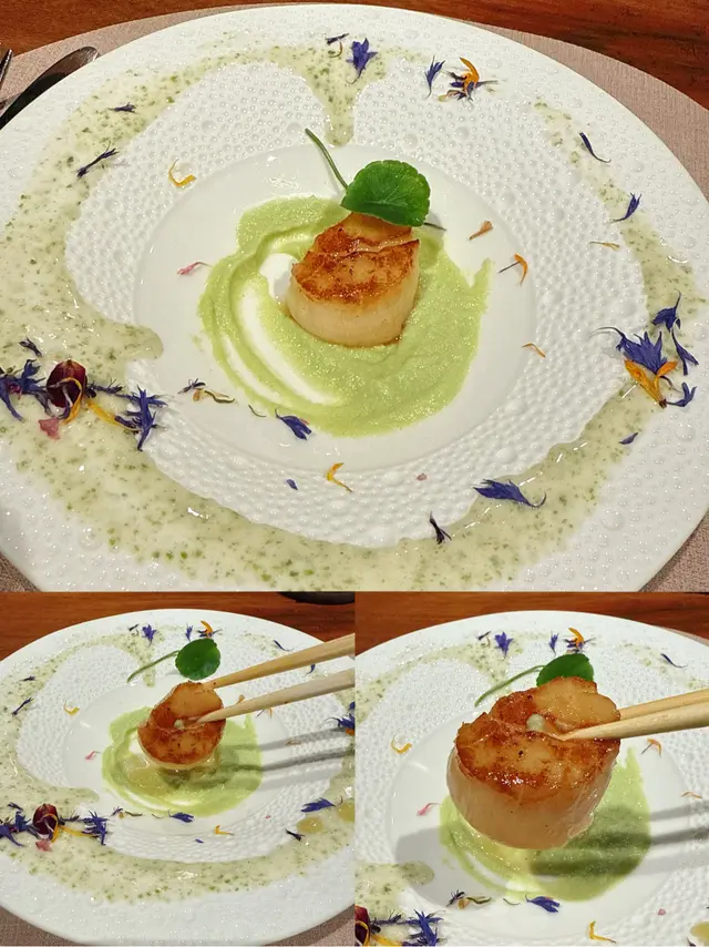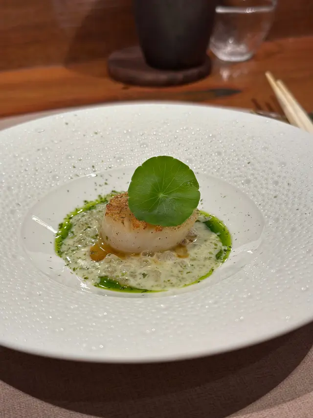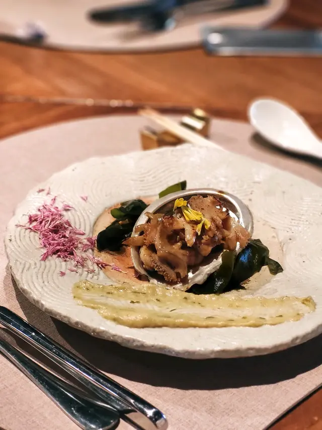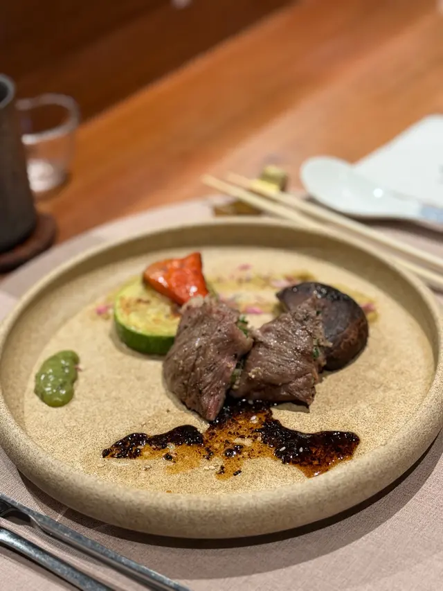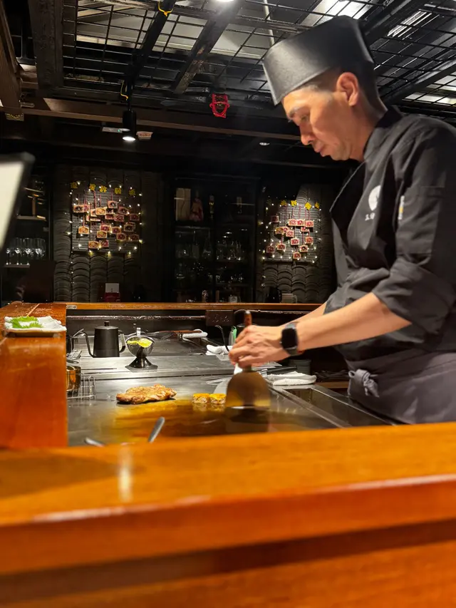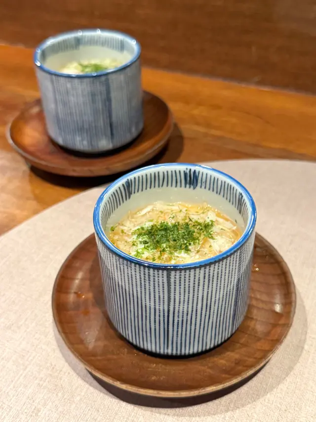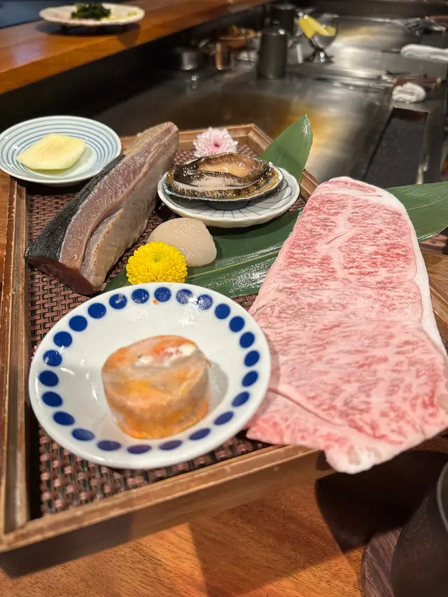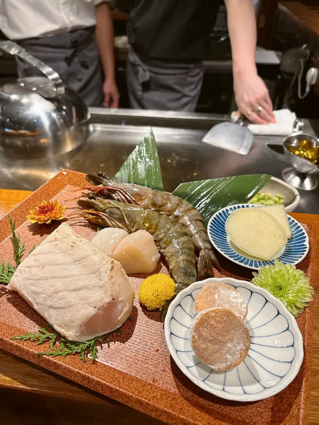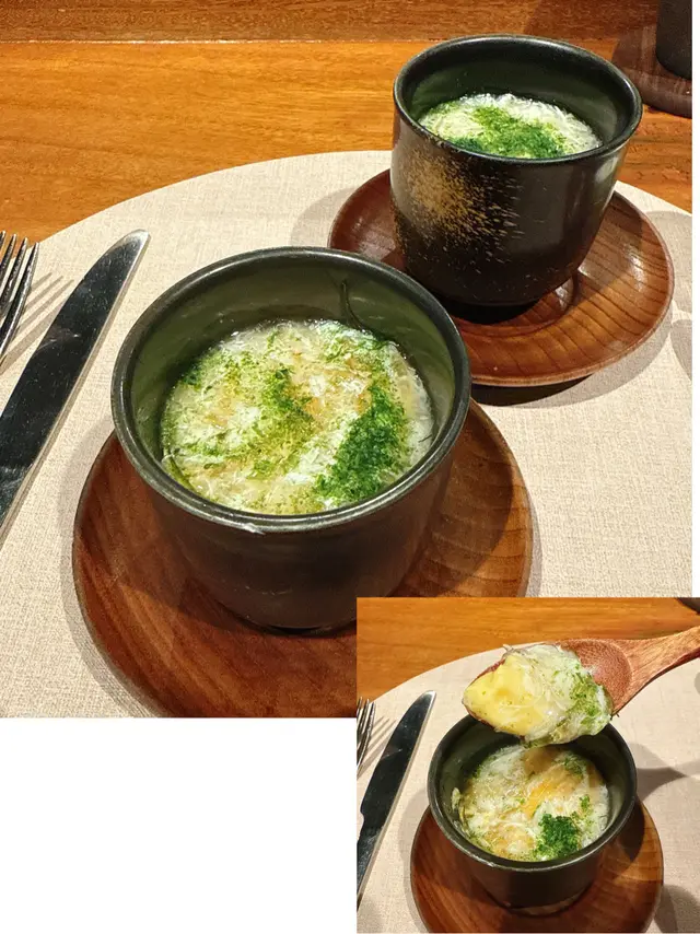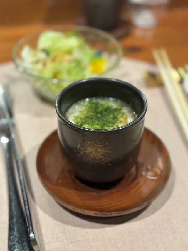 旅行結束返香港,把握放假嘅尾巴,黎北角三分熟鐵板燒。炭火料理,嘆番個味覺嚮宴先同老公午市黎到,一人嗌左個[媄]一人前,$5981️⃣先付一田園野菜沙律三色車厘茄柚子胡麻醬提升酸度,個醬汁真係勁香!2️⃣熱一水野茶碗蒸蟹肉魚翅茶碗蒸啖啖蟹肉鮮味,簡單海苔粉調出味道蛋味香濃,質感幼滑3️⃣荀一北海道帆立貝伴毛豆あん賣相吸引,香氣十足煎香外層,入面保留半生熟口感,火候恰到好處,入口即溶,好味👍🏻順帶要讚搭配的忌廉汁因為加左日本冬瓜莎莎,令帆立貝入口感覺更清爽4️⃣炭 一稻草鰹魚伴黑蒜油醋豆乳醬芝麻、香蔥、紫菜,黑醋味道滲入魚身,令魚味變得更突出油脂感重,留有餘香另外配搭豆乳醬,個人覺得食原味更好5️⃣辰一赤の匠板燒海虎蝦師傳將蝦切成三段,蝦身都幾厚身,好有口感,啖啖肉食得好滋味師傅好細心咁切開蝦頭,蝦頭膏混入蝦肉零舍濃郁💯虎蝦非常新鮮彈牙,地中海海鮮醬,好有層次既帶有濃烈香料味,又有檸檬嘅酸香,微微的辣,十分出色最後食埋海帶去油膩感6️⃣味一創味煎鮟鱇魚肝配焦糖蘋果鮟鱇魚肝煎到兩邊焦脆,食落味道似魚春或吞拿魚扒,肉質粉嫩,完全唔腥焦糖蘋果同埋山椒醬汁甜感皆重而且食完之後,口腔仲感覺到魚肝的漿口餘韻😆幾特別7️⃣主一蒜香薄燒和牛 & 京一野菜三品主食除咗牛肉之外仲可以選豚肉或地雞薄燒和牛我哋叫咗五成熟,剛剛好!配嘅黑松露黑醋醬真係超香口,蘸牛肉同蔬菜都好好食另外又有藤椒醬,增添中式嘅麻辣口感,鍾意食辣嘅朋友可以試吓燒野菜有日本南瓜、啡菇同翠玉瓜配埋茄子Mousse醬口感舒服8️⃣样一菊志炒飯鐵板燒炒飯炒到粒粒金香,伴有櫻花蝦嘅鹹香味,飽肚又好食附有紅酒蕎頭可以撈嚟食9️⃣吸物一高野吸物係暖肚又足料嘅味噌湯!🔟甘味一洋果子豆腐雪糕上仲有芋頭脆片口感多層次之餘為呢餐劃上完美句號…查看更多