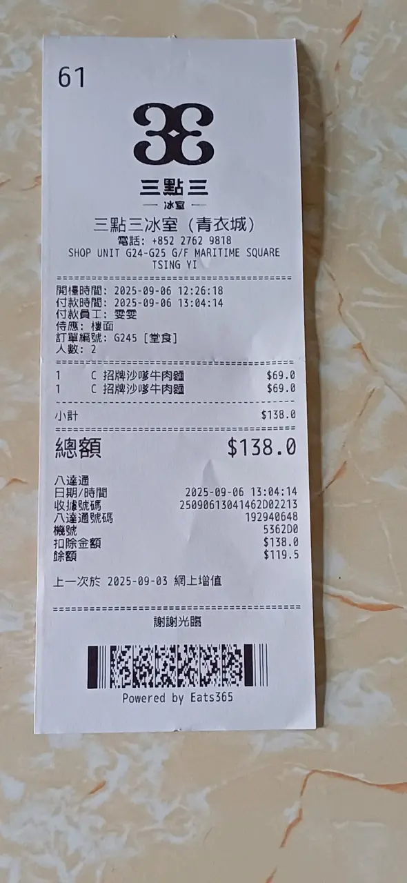 三點三冰室 (青衣) 網址: https://s.openrice.com/QrbS0K2CD00 地址: 香港青衣青敬路31-33號青衣城1地下G24-G25號舖 電話: +852 27629818