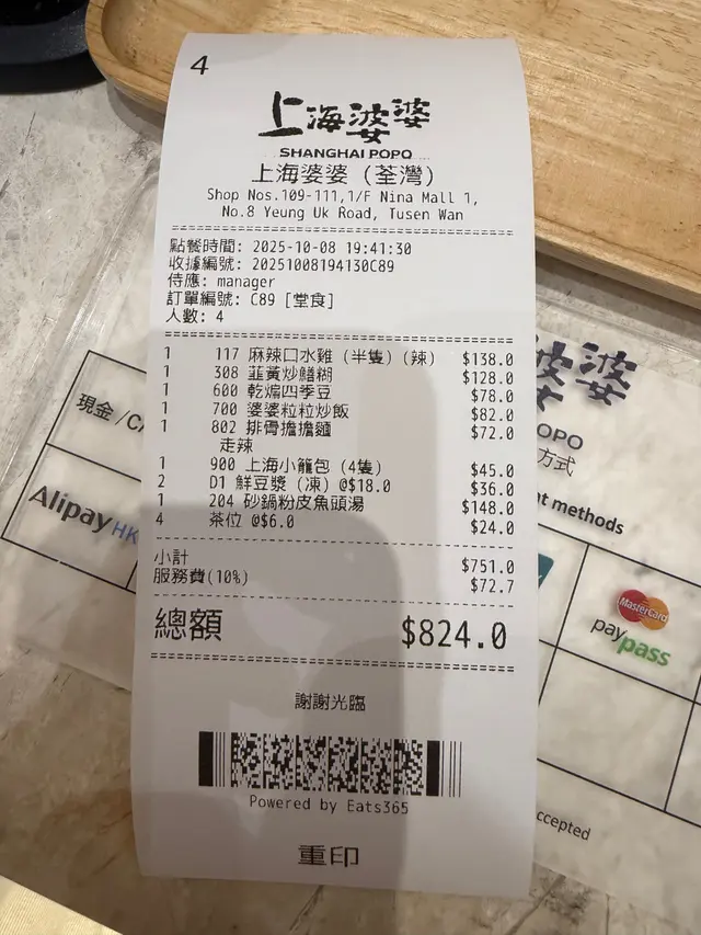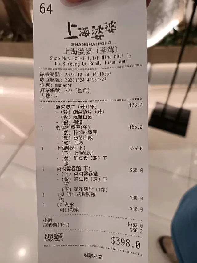 上海婆婆 (如心廣場一期) (荃灣) 網址: https://s.openrice.com/QrbS0xJWD00 地址: 香港荃灣楊屋道8號如心廣場一期1樓109-111號舖 電話: +852 27196288