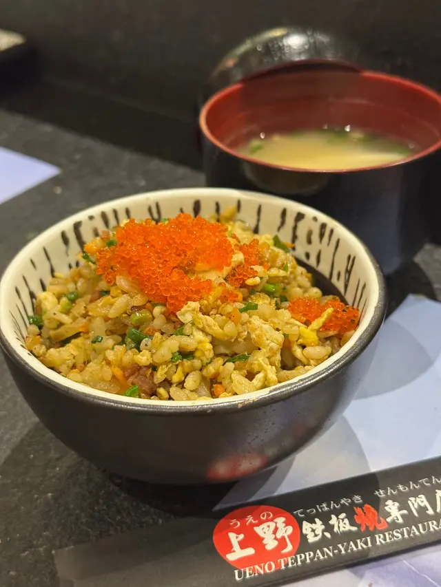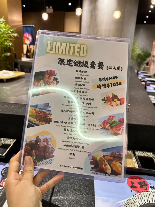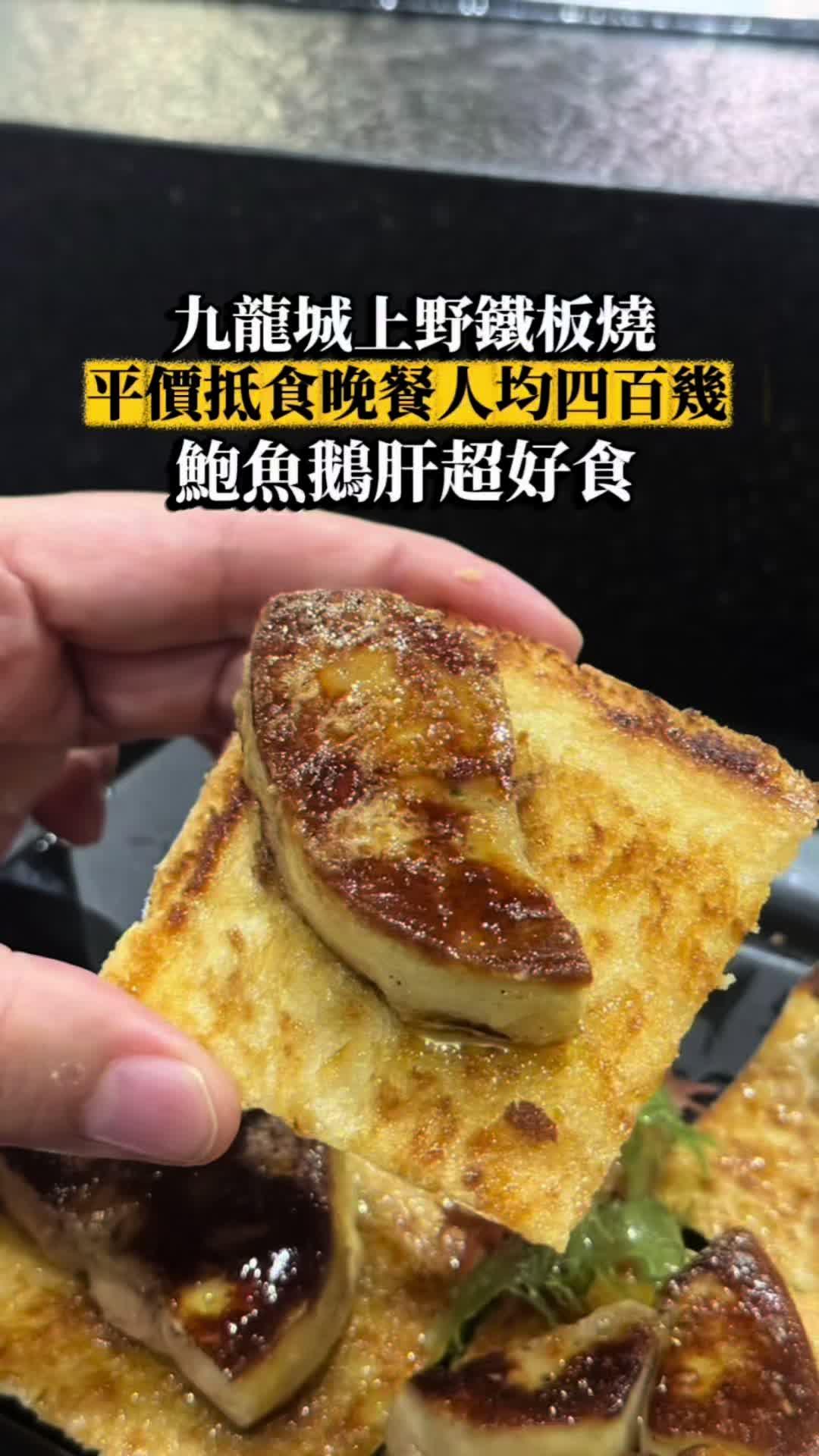 一個人想食鐵板燒梗係可以啦,今日去九龍城買嘢路過呢一間「上野鐵板燒專門店 」老店已經喺旺角開咗好多年,而且一向以抵食見稱,門口望望餐牌,店員落力招呼,睇中咗邊一個鐵板餐都可以變為一人前,咁就唔幫襯都唔得啦🤣入到店舖見到有個大魚缸,原來海鮮例如龍蝦、鮑魚、大蝦等等都係新鮮即撈,質素保證👍⭐️鐵板活鮑魚套餐(二人前) $ 868 |一人前 $ 434人均四百幾,晚市嚟講真係相當抵食,尤其係活原隻鮑魚,大大隻口感煙靭又彈牙,食得出相當新鮮,銀鱈魚皮脆肉嫩,薄切牛肉包住香蔥和蒜,五成熟剛好相當惹味,煙肉黃金炒飯都相當有水準,炒得香口粒粒分明,另外仲忍唔住追加一份鵝肝,超大件可以一開四,煎得外脆內柔潤,配上焦糖多士,非常美味👍👍✨豆腐和風沙律✨三文魚刺身✨鐵板配菜✨鐵板活鮑魚✨香煎銀雪魚✨美國安格斯薄燒✨煙肉黃金炒飯✨日式炒時菜✨活蜆雜菇麵豉湯✨芝麻雪糕✨煎鵝肝 $ 188 (追加)…查看更多
