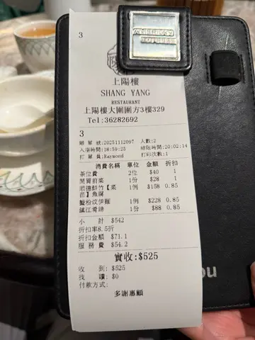 上陽樓取名靈感來自御膳房,融合了皇帝御膳房的設計, 粉綠色為主調, 配上清麗的壁畫,風雅脫俗, 環境相當舒適寧靜。 雪蛤水鴨湯 $78(位)熱湯清徹味濃,湯頭鮮甜,用料十足, 水鴨燉至綿軟鮮嫩, 滑捋捋的 雪蛤, 養顏又滋補, 女士摯愛的湯水。 冶味粉絲焗大蝦球$188(例) 大蝦球入口鮮味爽彈,啖啖濃郁惹味, 充滿鑊氣 , 粉絲吸收了 蝦汁的鮮香, 特別好吃 。鎮江肴蹄 (水晶肉)$88 江蘇鎮江傳統名菜 , 晶瑩剔透像水晶, 入口滑溜 Q 彈, 咸鮮十足。金蒜粉絲蒸大元貝兩隻 $96 厚身圓潤連殼大元貝, 表面鋪滿金蒜及粉絲, 香氣十足 ,元貝鮮味 滑溜, 加上金蒜香氣提鮮, 惹味開胃,粉絲吸收蔥蒜芳香, 特別滋味 好吃。芒果卷冰冰涼涼的芒果卷 , 外層煙韌柔軟,內餡是熟透的芒果粒及香滑的鮮忌廉, 每一口都是芒果的甜香, 香甜冰涼, 令人回味無窮。…查看更多
