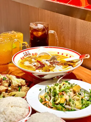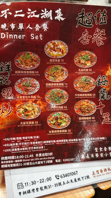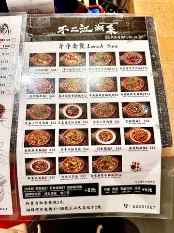 餐廳:不二江湖菜地點:銅鑼灣登龍街菜式:川菜餐牌:午餐有套餐,有19款飯,有辣有唔辣,可以加錢要飲品。落單用QR code。不二酸菜魚飯 $73 不二酸菜魚好大兜,有連皮滑溜魚片配有大量酸菜加萵苣片,材料豐富新鮮。可以揀辣度或者唔辣,我地叫左唔辣,都好夠味,鹹度剛好。鮮椒雪花牛肉飯 $73 呢個餸有唔少牛肉同埋紅綠椒粒加蓮藕粒同炒,我叫左少辣,味道已經夠辣,唔食辣椒粒就唔辣,呢道菜有爽口蓮藕粒好特別。農家小炒牛肉飯 $62 熱辣辣上枱,好有鑊氣。好多嫩口牛肉片撈有菜苗,洋蔥絲同紫洋蔥絲同炒,味道鹹香,好多料,呢個餸係唔辣,味道都好惹味。份量好多。每份餸都跟有一碗白飯。芒芒梳打 加$8百香果梳打 加$8凍柚子茶 加$8梳打超大杯,附上獨立包裝飲管。芒芒梳打芒果味濃,唔會太甜。百香果就清新d,仲加有青檸一件。凍柚子茶有唔少柚子皮喺底,甜度適中,三杯都好解渴解辣。總括而言,呢度食物質素高而好大份,呢個價錢抵食。餐廳星期日晚飯時間前都有唔少食客同外賣單。…查看更多