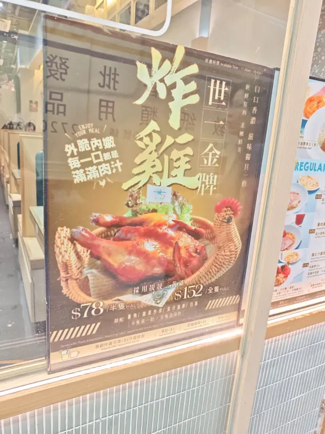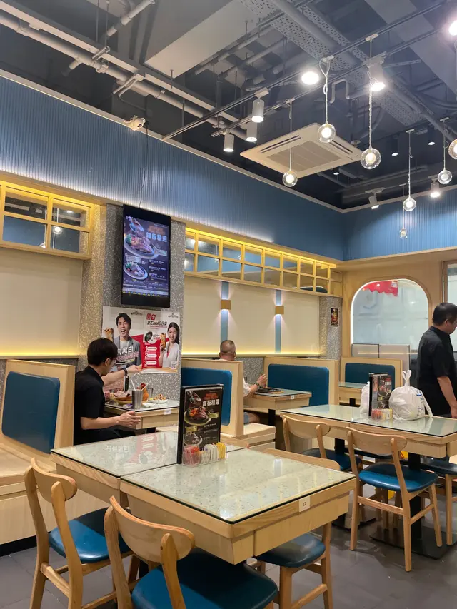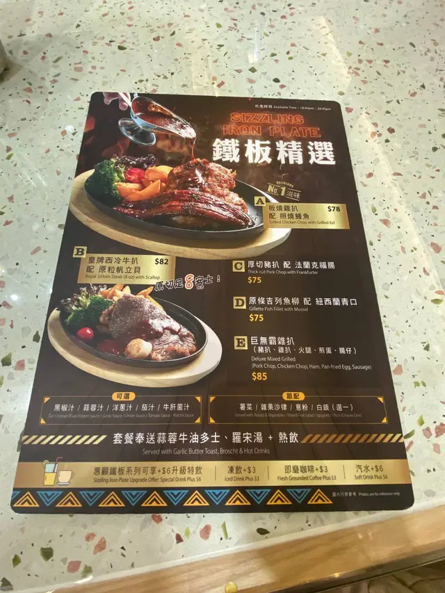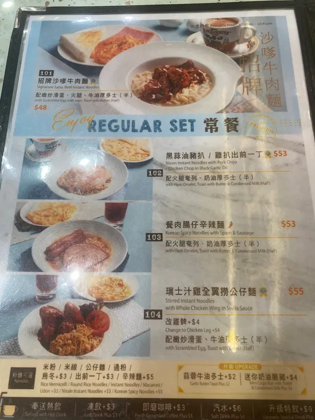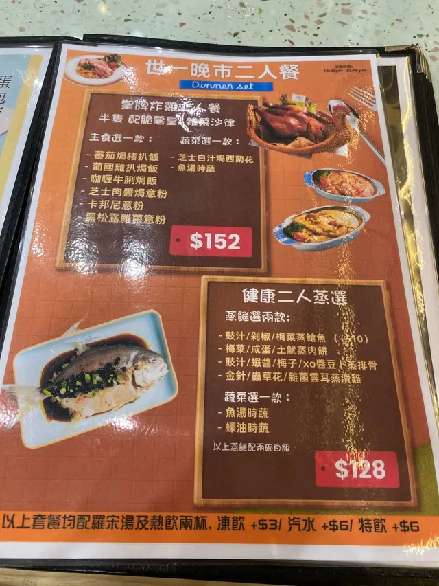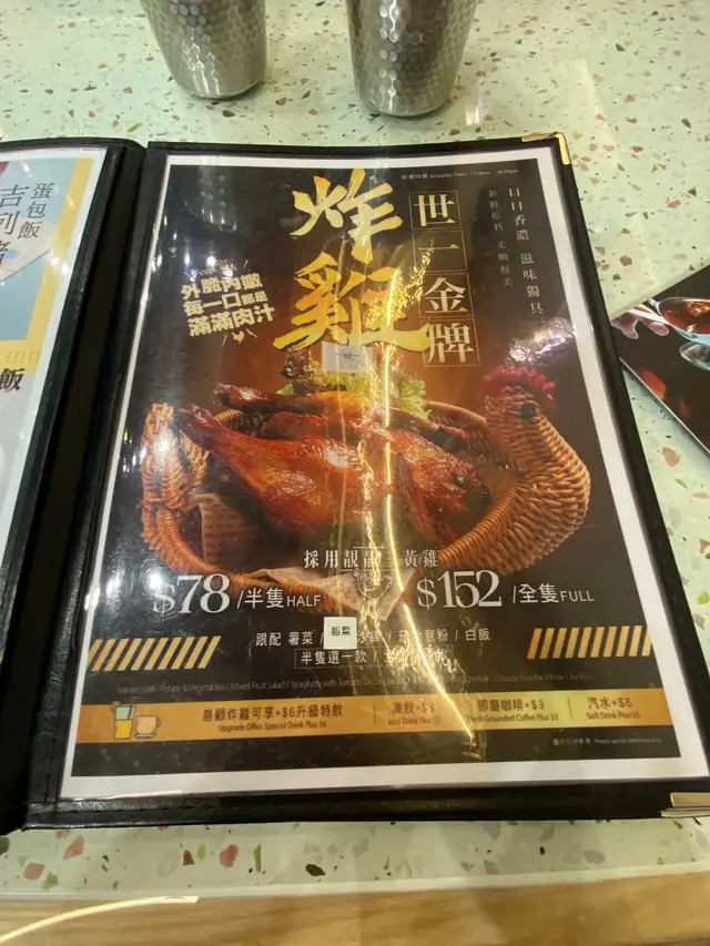 ,一來平靚正,二來啱我哋啲麻甩佬。踏入餐廳,一室以湖水藍為主調,樓底亦較高,以茶記而言,空間感很好,加上地方企理,夠光猛。話就話香港經濟唔好,但唔喺講笑,接近坐滿,聽到店員跟顧客啲對話,就知街坊多。基本茶記設定,枱面放咗啲調味包,枱側枱桶就放滿餐具,排列整齊。講到食物,茶記勁就勁在乜都有,由鐵板精選,到常餐、蔥油系列、日式蛋包飯、世一金牌炸雞、西式碟頭、秘製馬來咖喱、皇牌焗飯、意國風情、健康蒸選、鮮魚湯泡飯、小食,以及各款飲品。晌門口仲見到有啲二人小菜套餐、二人蒸餸套餐,定價亦好實惠