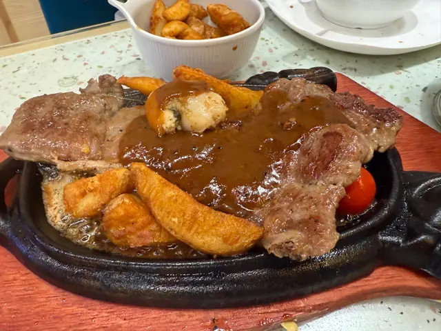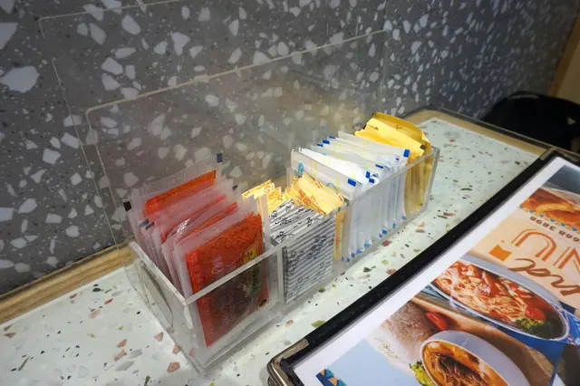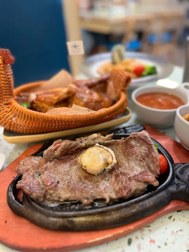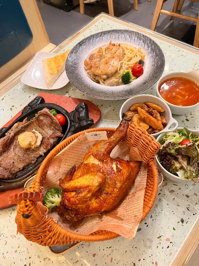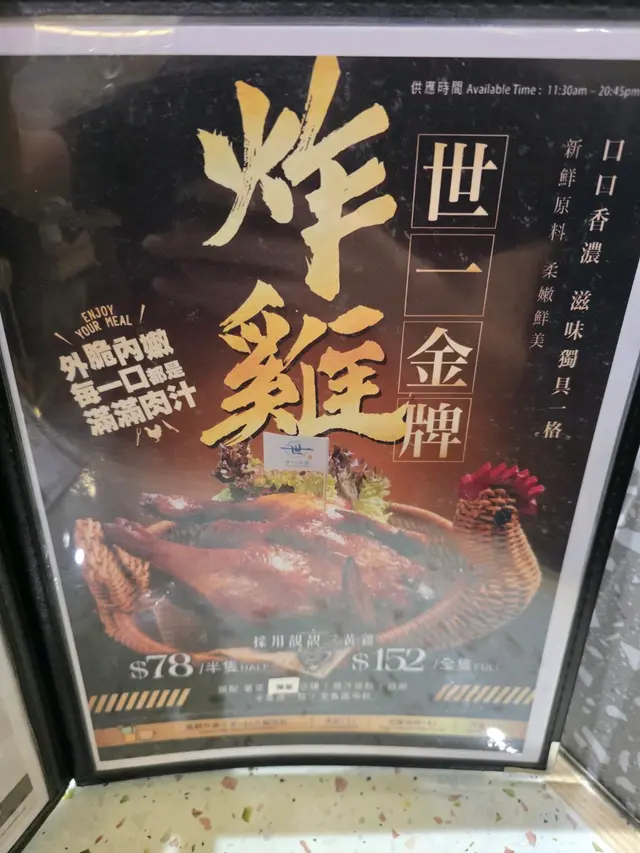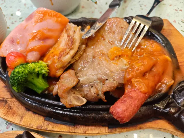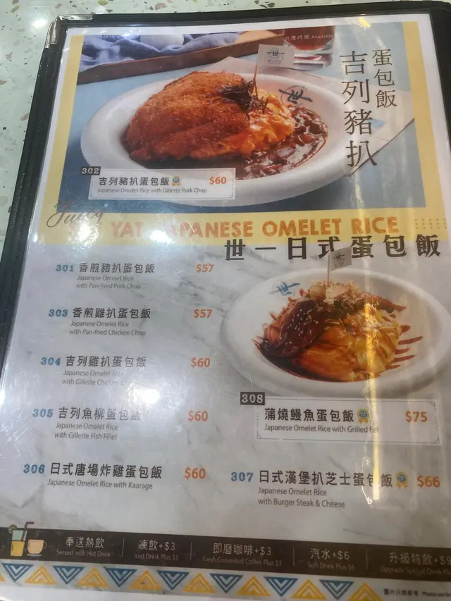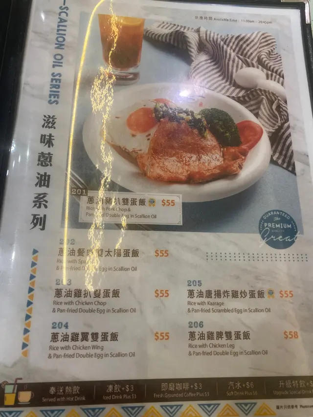 ,一來平靚正,二來啱我哋啲麻甩佬。踏入餐廳,一室以湖水藍為主調,樓底亦較高,以茶記而言,空間感很好,加上地方企理,夠光猛。話就話香港經濟唔好,但唔喺講笑,接近坐滿,聽到店員跟顧客啲對話,就知街坊多。基本茶記設定,枱面放咗啲調味包,枱側枱桶就放滿餐具,排列整齊。講到食物,茶記勁就勁在乜都有,由鐵板精選,到常餐、蔥油系列、日式蛋包飯、世一金牌炸雞、西式碟頭、秘製馬來咖喱、皇牌焗飯、意國風情、健康蒸選、鮮魚湯泡飯、小食,以及各款飲品。晌門口仲見到有啲二人小菜套餐、二人蒸餸套餐,定價亦好實惠