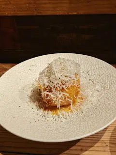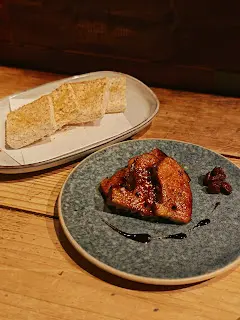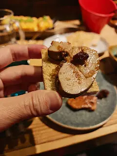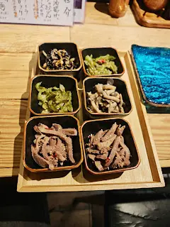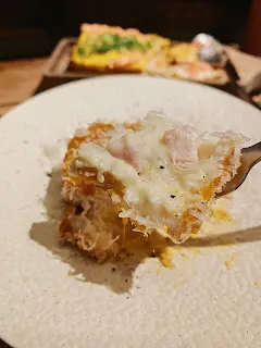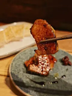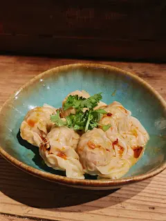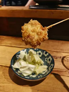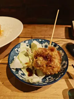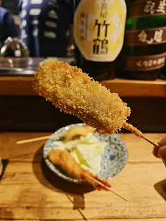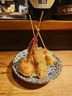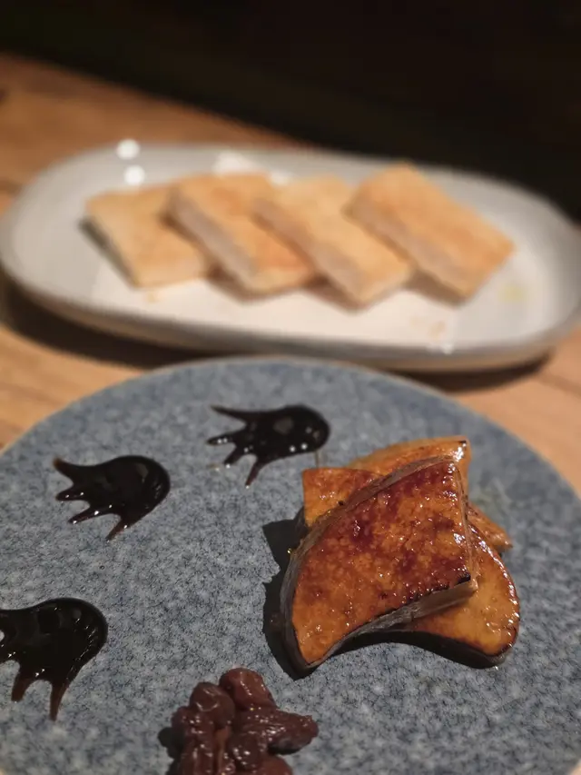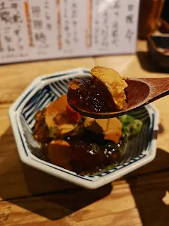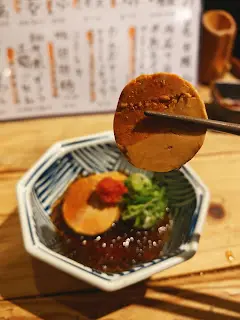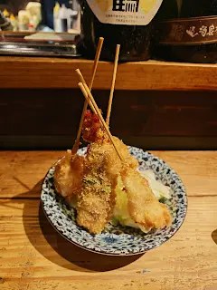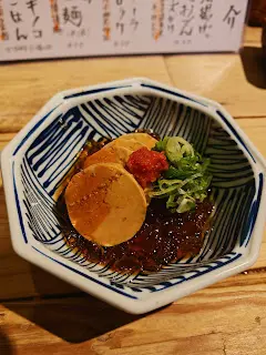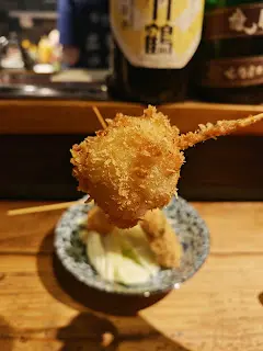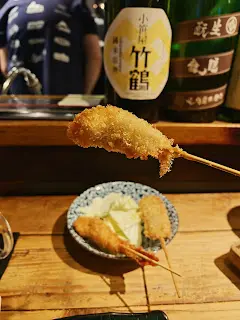 日籍廚師主理,大阪炸串專門店,新派和食,菜式組合充滿新意,麻辣入饍,芝士誘惑,令人心生好奇,不得不多點幾款。前菜兩款 $30店員送上六小碟,咁多!原來每人可以揀一款。我選了牛腱及香菇,家常味道,稱職的前菜。魚肝配土佐酸醬 $78我非常喜歡吃魚肝,尤愛那豐富粉糯的口感,入口即化,這裏配合酸度適中的土佐酸醬啫喱,食落全無滯感,反而令我更開胃,非常合拍。焦糖鵝肝伴多士 $108鵝肝一面塗上焦糖,燒至脆卜卜,倍增口感;鵝肝煎至剛熟,軟脆對比明顯,再配合多士,口感一流!炸串: $48帆立貝 $28蝦 $48沙椎魚 $26蘆筍豬肉卷 $26來到專門店,沒有理由不吃串揚。酥脆不膩,炸漿薄,材料新鮮,點了五款,各有風味。配備特色醬汁及生菜。明太子芝士玉子燒 $98日本師傅坐鎮的玉子燒絕對冇得輸!首先賣相漂亮,一大塊長形厚底磚頭,金黃亮麗,兩端微焦,中層藏著色澤鮮紅的明太子,切開見混合了半溶芝士,緩緩流出,對比青蔥的綠。入口香滑,層次豐富,頗飽肚。特製海蝦紅油炒手 $88日本料理都有紅油炒手!又做得幾好喎!雲吞皮薄蝦大粒,口感順滑,有蝦有肉的香,紅紅的辣椒油,其實很溫和,唔算好辣。超濃厚!自家製炸卡邦尼奶球 $88唔講仲以為是甜品,炸奶球真有創意,把卡邦尼的火腿雞蛋忌廉汁藏在酥炸奶球內,外脆內軟,很美味。初秋·和牛·栗子·野菌釜飯 $268 坐在吧枱,近距離看着在煮釜飯冒出的蒸氣,飯香撲鼻,怎可以忍得着不點一份呢?時令的和牛栗子野菌最好不過,和牛粉嫩半熟,黑松露醬非常香,米飯飽滿光澤,更有飯焦。位於商廈的店舖面積不大,氣氛熱鬧,運作暢順有效率,員工禮貌,食物唔錯,價錢合理,值得再訪。小店亦有推廣清酒放題,好酒之人的佳訊。 #串カツ専門店 #銅鑼灣 #日本菜 日本清酒…查看更多