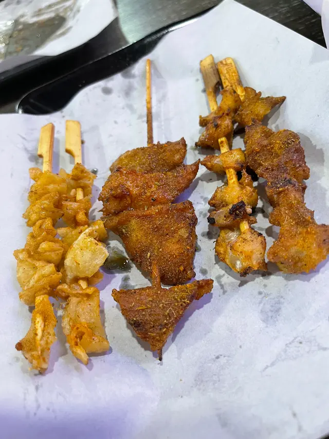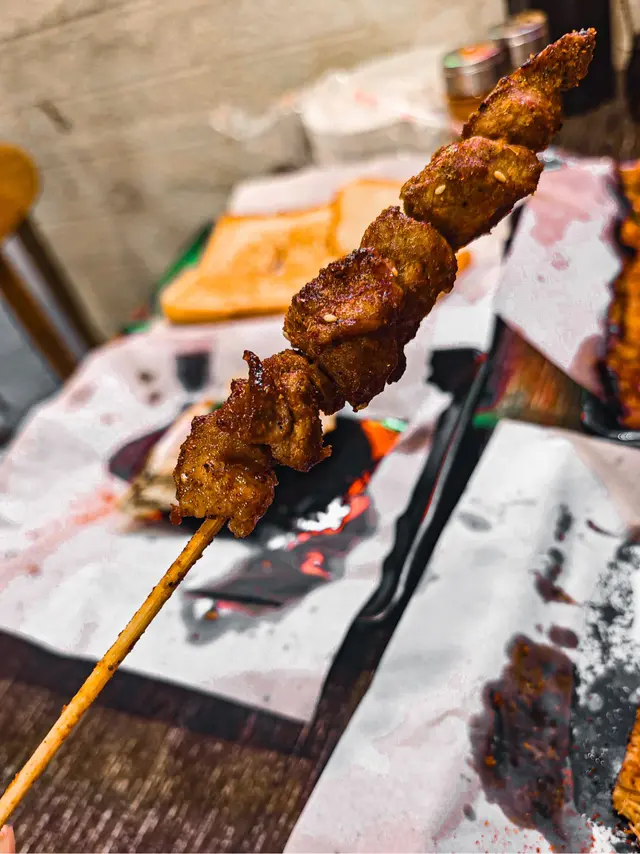 。五花腩肉串,五花腩肉肥瘦均勻,燒到油脂半融,肥肉部分香而不膩,瘦肉嫩滑。再落咗少少孜然同辣椒粉,可以平衡咗豬肉油膩,又增添異域風味