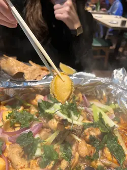 之前食過麻辣風雲好正,呢晚來到同一集團的串里試下!一去到大大串里街道招牌已經好吸引我!店裡四圍都係香港著名嘅景點和招牌滿滿香港情懷好有feel🥰坐位闊落舒服👍🏻.➡️邪惡串里秘製雞皮 $48➡️汁燒牛舌芯 $38➡️汁燒金菇肥牛卷 $38➡️雙皮奶卷 $58➡️香辣紙包雞【半隻】$198『紙包火鍋配料』鴨血【輕量】$18『紙包火鍋配料』芋絲【輕量】$13『紙包火鍋配料』 唐生菜【輕量】$13『紙包火鍋配料』鵝腸【輕量】$38🍻Asahi 朝日 $29.呢到最有名就係火鍋同串燒,全部都點哂🤣香辣紙包雞成煲上,半隻雞兩個人食剛好,香辣惹味食完就加湯打邊爐🍲鴨血意外地滿不錯👍🏻.小食係最驚喜🤩必試雞皮賣相一流仲識噴煙即刻相機食先😎 大大塊送脆卜卜椒鹽口味送酒岩哂,檸檬仲插咗串里好得意😆 雙皮奶卷又係喜出望外!好香芝麻味道,外層脆口入面軟綿綿甜甜的濃濃奶香,好好食😋.串燒一樣出色好味到encore多幾款🤣牛舌有咬口燒得剛好,肥牛金菇perfect match燒汁甜甜地,雞軟骨幾大件椒鹽口味啖啖軟骨脆卜卜,牛肉餅口感似煙韌版魚腐,味道似牛丸幾有趣.環境有特色舒服,價錢親民又好味又可以打卡,滿推介👍🏻…查看更多
