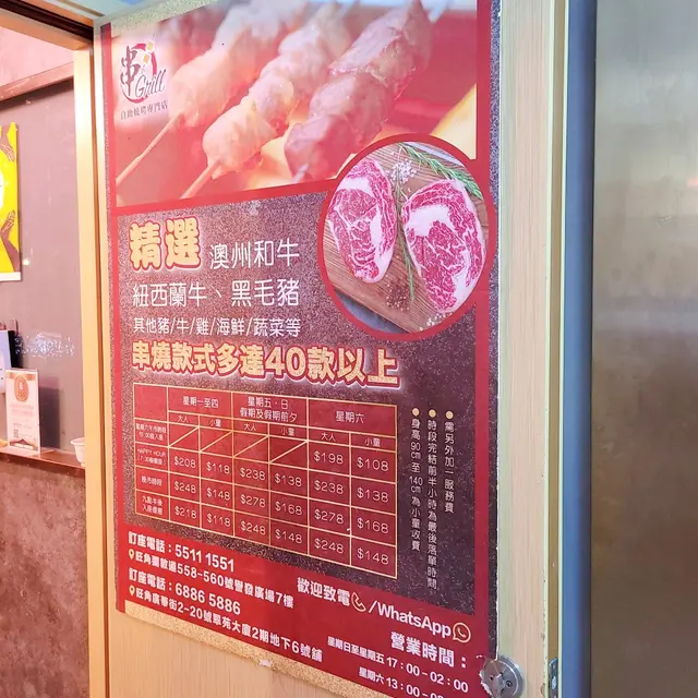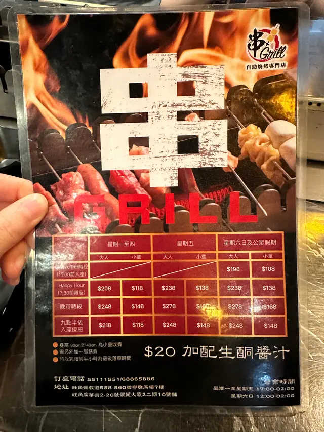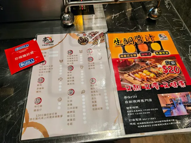 串Grill 自助燒烤專門店 (廣華街) (旺角) 網址: https://s.openrice.com/QrbS0WrC900 地址: 香港旺角廣華街2-20號翠苑大廈2二期10號舖 電話: +852 55111551