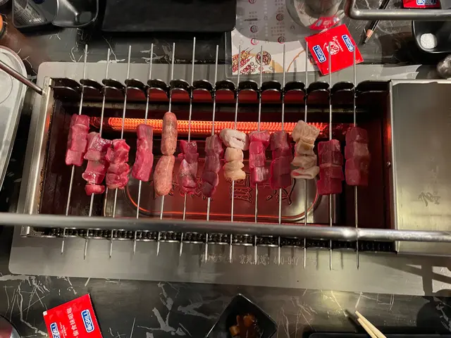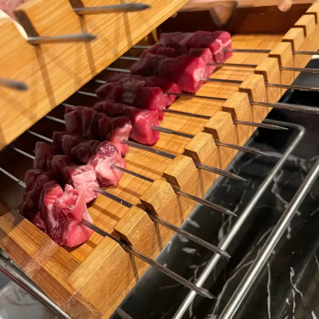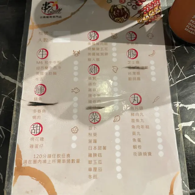 原本打算吃的餐廳突然關門, 只好在附近看看, 提出很多方案朋友都一推再推, 結果就選擇了這間串燒店。串燒店是自助任食的, 肉類 (豬牛羊雞均有), 菜類菇類, 少量海產, 綿花糖, 菠蘿🍍, 連雞蛋仔都有, 對我而言種類還算可以。不過下單以人頭計, 即假如二人計, 每次下單每款食物最多只可下二人份, 想再叫就要再一次下單, 這個稍為不便。環境都算寬敞, 感覺也很整潔, 有一個中雪櫃在中央, 可以任意飲用。桌上有三款醬汁🍯, 分別是燒汁, 泰式辣汁和袖子汁。基本上每款串燒都會用燒汁掃一掃, 像燒烤時一般會把食物沾上蜜糖一樣。所以就算沒有添加另外兩個汁味道也足夠, 況且泰式辣汁比較難配搭, 袖子味反而可以減少油膩感。一定要談一談串燒店最特別之處, 就是360自轉的烤爐, 我們不用動手, 把食物放到爐上面, 只要位置配合食物會順著軌道自轉, 最適合一堆只愛吃的懶人😏 最初燒時覺得需要一定長時間才能吃, 不過越燒越快, 不久已經吃得很飽滿。因為都點了一堆食物, 不能盡錄, 只有將重點道出來。首先肉類而言A6牛柳和豬五花最好吃, 不會榎口, 其他牛與豬類都還好, 但要注意火候, 有時燒太久就變得很韌。菠蘿及蕃茄仔都很鮮甜, 日本蕃薯, 燒賣跟綿花糖跟平常燒烤一樣味道。基本上雞類全都不太好, 尤其雞皮和雞腎, 超級難吃! 😵💫 另外雞蛋仔比較像脆了的雪芳蛋糕, 個人覺得不用下單。離開前會有Häagen-Dazs 雪糕贈送, 這個算是不錯的飯後甜點😚 另外服務都不錯, 服務員看到我們某些食物沒有轉動時都會提點。只是由於食物只有幾類比較出色, 但價錢並不便宜, 星期五, 六, 日及假期前更要多加$30, CP值一般。