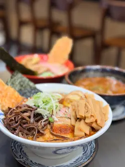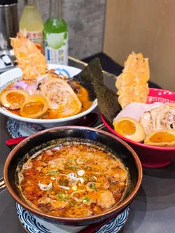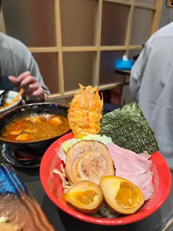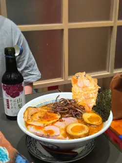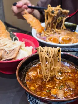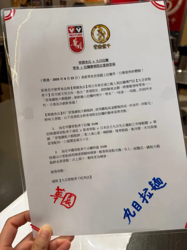 香港本地華園 x 丸目背脂煮干 原隻鐵板大蝦拉麵🦐冇諗過蝦湯拉麵配蝦餅 創新得黎又幾夾😝 香港老字號零食華園食品 同東京過江龍拉麵丸目背脂煮干合作聯乘 將懷舊蝦餅融入蝦湯拉麵! 呢間拉麵店主打燕三条系背脂拉麵 之前食過覺得好特別 所以今次想試下呢個新產品有幾沖擊🤗 成個環境氣氛都好日系 店員亦會好熱心講解拉麵既特色同食法🍜華園原隻鐵板大蝦 x 海老辛醬背脂煮干拉麵/沾麵 $108橙紅色既蝦湯 以豚骨背脂 魚干 醬油熬成既背脂煮干湯做基底 再加入辛辣蝦醬 多層次鹹香中帶有微辛香 蝦鮮甜唔算太突出 金黃香脆既鐵板大蝦脆餅可以就咁食之外 浸一浸蝦湯更加突顯蝦香 又唔會太油膩叉燒幾出色 火炙豚腩半肥瘦甘香 慢煮豚肩柔嫩重肉香 溏心蛋夠曬溏心入味高質 仲有紫洋蔥 木耳 紫菜等配料 口感味道層次豐富 極太麵粗身彈牙掛湯 幾惹味沾麵湯味道明顯較濃 多一層醬油鹹香 更加突出蝦湯精華同辛辣香 沾湯裏面附有半肥瘦角切豚肉 食落好豐富 麵條比極太麵幼身少少 但都夠彈牙掛湯 重口味者會偏愛呢個沾麵多d🍚辣肉碎豚角背脂飯 $28舖滿肥瘦相間既角切豚肉 混入背脂既辣肉碎堆積如山 以及吸收豬油辣油精華既米飯 真係極香口邪惡😈🍗自家製南蛮炸雞 $28四大件香脆嫩滑juicy 他他醬都好惹味好夾🥟口福餃子 $28正正常常既日式餃子~🍹富士山柚子梳打/靜岡蜜瓜梳打 $24…查看更多
