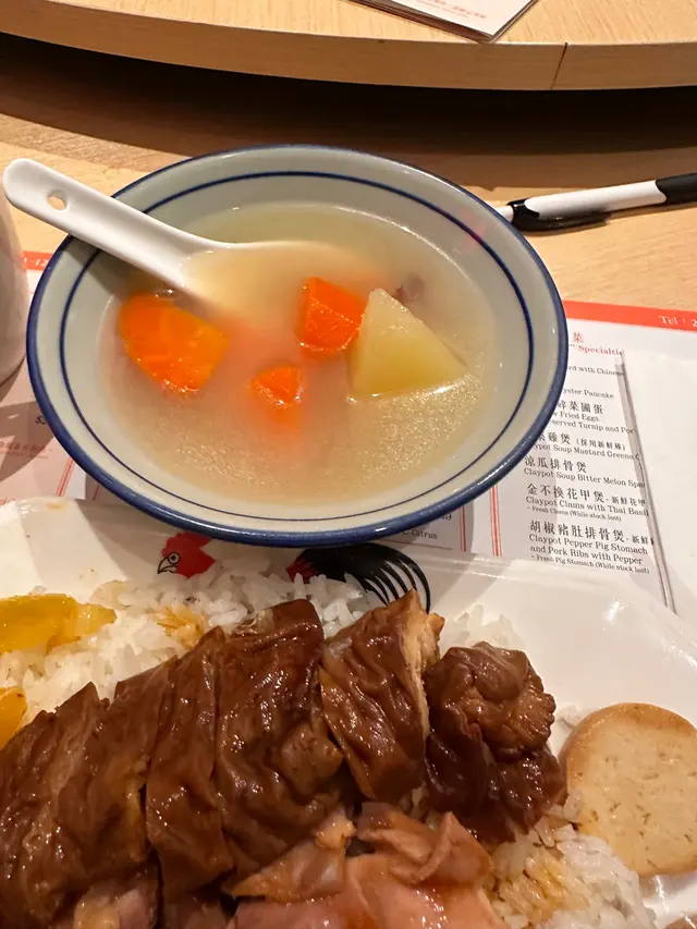 久両菜 解決午餐,今次我試咗一碗滷水豬腩肉豬大腸飯,配鹹酸菜同潮式札肉🥳 🍽️滷水豬腩肉豬大腸飯 + 配菜久両菜嘅店面好有中環街市舊式風味,一坐低就聞到滷水嘅濃香,食慾即刻大開!😋滷水豬腩肉豬大腸飯呢碗滷水豬腩肉豬大腸飯一出嚟就令人流口水!白飯鬆軟粒粒分明,鋪滿厚實嘅滷水豬腩同豬大腸,肉質嫩滑入味,表面滷得油光發亮,配埋濃郁嘅滷汁,每啖都充滿層次感!🍲 豬腩肥瘦適中,咬落又唔膩;豬大腸煮得軟腍有嚼勁,唔腥又香濃,飯粒吸收咗滷汁嘅精華配菜(鹹酸菜同潮式札肉)旁邊嘅配菜係完美加分!鹹酸菜酸爽開胃,解膩又提味,配飯食超夾;潮式札肉有兩舊出邊好少有得食咬落去juicy🥬 份量剛好,潮州風味濃郁一碗青紅蘿蔔湯係理想配角,湯底清澈見底,浮住幾片青菜,喝一口清甜又暖身…查看更多