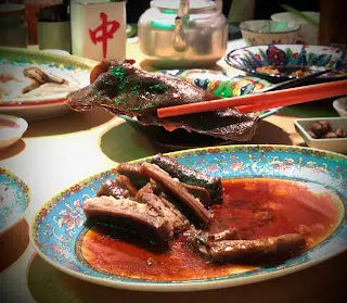 蠔餅,腩肉,滷水鵝片,四季豆,雞肉