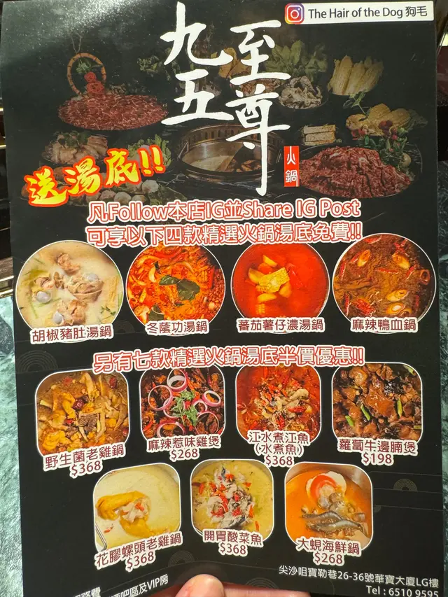 九五至尊火鍋狗毛 (尖沙咀) 網上訂座享低至8折優惠兼賺Rice Dollars 網址: https://s.openrice.com/QrbS07RWC00 地址: 香港尖沙咀寶勒巷26-36號華寶大廈LG樓 電話: +852 65109595