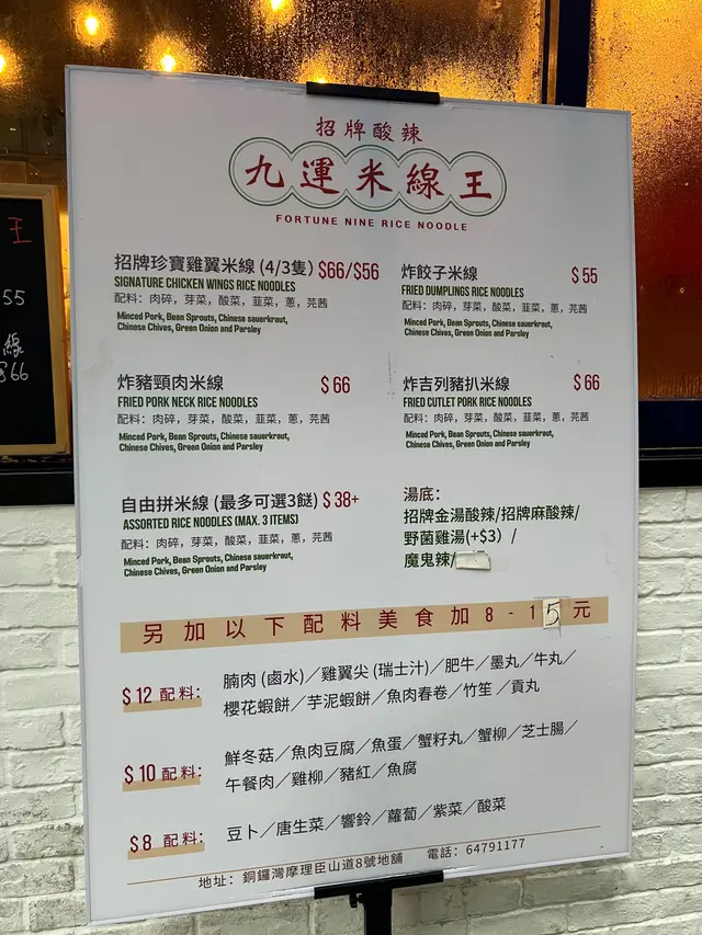 九運米線王 (銅鑼灣) 網址: https://s.openrice.com/QrbS01Xy7W0 地址: 香港銅鑼灣摩理臣山道8號地舖 電話: +852 64791177