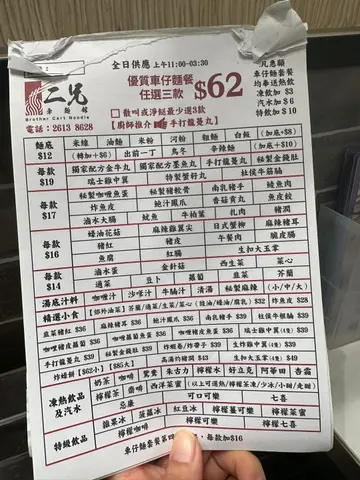 今日約咗朋友踩單車,還完架車喺大圍店,喺附近搵間車仔麵食吓先!呢間餐廳早上6:30就開門,營業到半夜3:30 ,長時間營業,落去食宵夜仲得😍大碗麵,沙嗲汁 $69(有豬紅,豬皮,蘿蔔,魚蛋,雞翼,雞翼尖,紅腸同菜)好多餸!豬紅、蘿蔔夠入味,薄豬皮爽口,魚蛋好扎實,雞翼同雞翼尖都好入滷水味,的確唔錯!仲要索晒沙嗲汁,好正!🤩朱小姐粗麵牛腩汁$69(有豬紅,豬皮,豬手,豬大腸,扎肉,貢丸 )呢個豬大腸醃的好夠味,豬手又夠腍,扎肉同貢丸正常,所有配了索晒牛腩汁,掂呀!☺️鮑汁鳳爪$36鳳爪炆得好腍,好入味,而且食完之後仲有好多鮑汁,正呀!😙紅豆奶茶 +$16第一次飲到紅豆味嘅奶茶,幾特別,啖啖紅豆味😇紅豆冰 +$10紅豆幾甜,加埋椰香,送車仔麵一流😍📍二兄車麵館 (大圍)大圍大圍道1-35號金山樓地下2號舖…查看更多