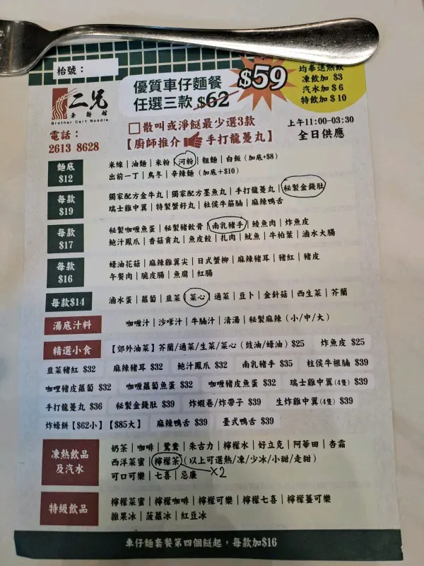 二兄車麵館 (大圍) 網址: https://s.openrice.com/QrbS0wBmB00 地址: 香港大圍大圍道1-35號金山樓地下2號舖 電話: +852 26138628