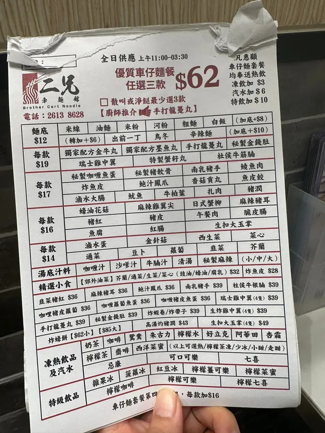 深宵搵食,大圍算多選擇,有位有地方坐,但要食車仔面就難有,今日行過大圍油站,有間以為係茶記,原來係車仔麵主打鋪,應該講係車仔麵加茶記,今次試油麵加車仔麵三寶配腩汁同沙嗲醬,味道清啖正常偏乾淨,但食唔出那渣麵(車仔麵另一名)風味,算係蘿蔔有蘿蔔味(3件),豬皮有豬皮味(3塊),豬紅有豬紅味(多過5粒1),車仔麵套餐最低消息要$62配熱飲,將來食就要留意價錢,我今次食$58料都要俾$62,問過職員,佢只答我係套餐,叫我下次留意,今次已入單,廚房都出咗餐改唔到,食野都要食經驗