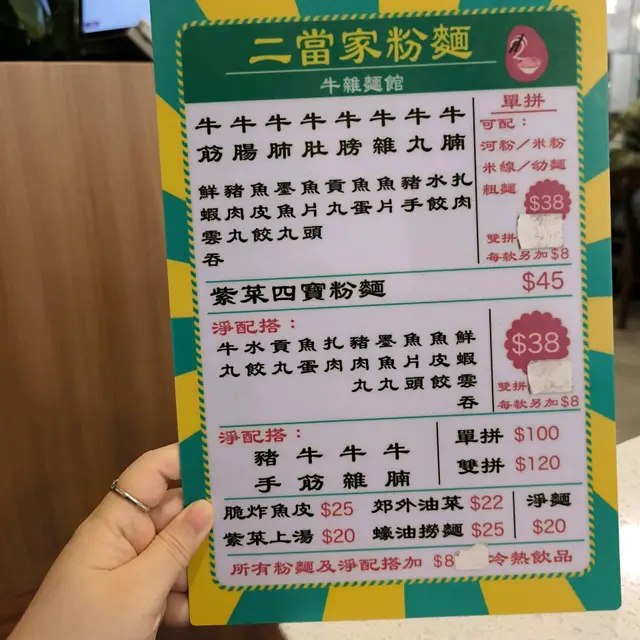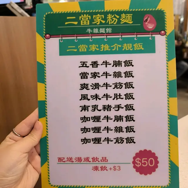 勝在多款式! popcorn55等級42024-01-11564 瀏覽 關注 放飯諗唔到食乜通常會去二當家貪佢哋杯凍飲夠大杯粉麵餐一概加$8,印象中好似冷熱同價(我從不飲熱飲所以冇留意)牛腩都幾好食,唔過咸,又唔韌冇特別去數有幾多舊,但份量我覺得合理個人喜好係粗麵口感最好!$38凍飲 +$8又一餐紫菜四寶河都幾好魚片頭冇炸過火我幾鍾意都幾彈牙,唔錯加一匙佢哋嘅辣椒油寧舍好味聯和墟街坊會將呢度同水上人比較咁老實講句二當家份量係細少少但優點係又有常餐又有頹飯一班人放飯總有一款啱心水唔洗就得呢個又就唔到邊個…Btw啲呀姐幾熱情招呼黎得多佢已經知我哋食乜咁🤣…查看更多+ 4以上食評乃用戶個人意見 , 並不代表OpenRice之觀點。讚好分享勝在多款式! 二當家粉麵 https://s.openrice.com/QrbT0Xj9F00檢舉 張貼 評分4味道4環境5服務4衛生4抵食用餐途徑堂食
