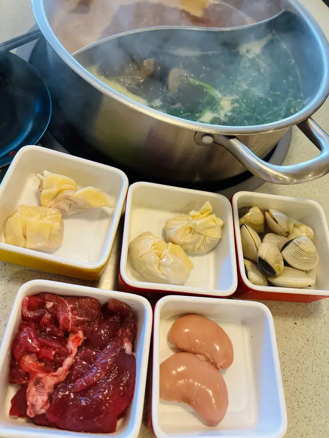 火鍋配料任食超過100款,從雪花牛肉、海蝦、蜆肉,到手打丸、雲吞、水餃及新鮮蔬菜,選擇多到眼花撩亂。