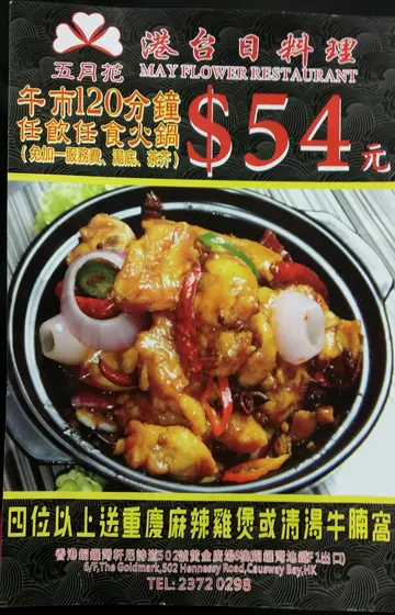 五月居火鍋放題 (銅鑼灣) 網址: https://s.openrice.com/QrbS0GnO200 地址: 香港銅鑼灣軒尼詩道502號黃金廣場6樓 電話: +852 2372 0298