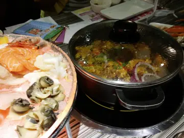 第一次黎,係一間銅鑼灣大廈樓上鋪的餐廳。雞煲簡左中辣,食落去味道只覺得尚可,相比之下,一品雞煲會比較入味。然後加湯可以打邊爐,打邊爐的配料有很多選擇,可以自助調自己想要的豉油、蒜和辣椒。另有多款日式熟食,但軟殼蟹不夠脆。多數凍飲色素多,飲落去感覺是化學水味,不太健康。飯後有朱古力沙冰送,但味道真的一般,賣相及味道比一般甜品鋪差。