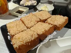 蝦多士 炸得金黃酥脆,蝦膠厚實,配茶最一流。
