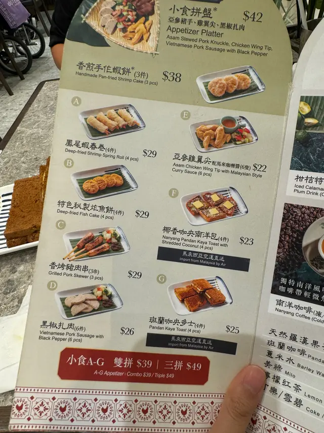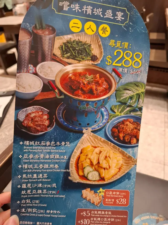 十一國慶,旅行好貴,所以留港消費。 而且很多餐廳在國慶日推出七折優惠呢!看戲後,這家有七折的餐廳,店門已大排長龍。等了半小時,即可入座。點了雞魚豬菜,炒粿Kaya多。明爐怡保咖哩阿參魚 大大盤上枱,以小火加熱,大堆頭,有睇頭。魚~係炸過。這條魚體積比較細小,骨少,但肉質嫩滑如茄子!個人比較喜歡馬拉當地使用魚肉實淨的大魚! 咖哩不辣,湯身微微酸。湯裡還有Lady Finger,洋蔥,蕃茄一起加熱。可是二個火種很快熄滅,洋蔥還未煮熟。要夾硬把盤裡健康但未熟蔬菜,食曬佢。阿參豬手 本想點藥豬骨煲,但為方便大家分享 ,改為豬手。豬手大大件,連骨上碟。肥多肉也多,很入味。亞參去骨海南雞 全雞己去骨,雞胸肉都是滑滑,這個雞合格了。但一碟三色調味醬不足夠,早知多要一碟。馬拉炒粿條 粿條煙韌,黑醬油鹹中帶甜,整體辣。馬拉盞通菜 炒通菜配馬拉蝦醬,只是三十八個大洋,抵!咖吔多士 南洋名物,大塊牛油拌kaya醬夾在啡色多士之中,跟足彼方的規格。南洋咖啡 細細杯的南洋咖啡,連細小的杯碟花紋也是南洋風。七折後,埋單四百有找,平均每人八十個大洋。…查看更多