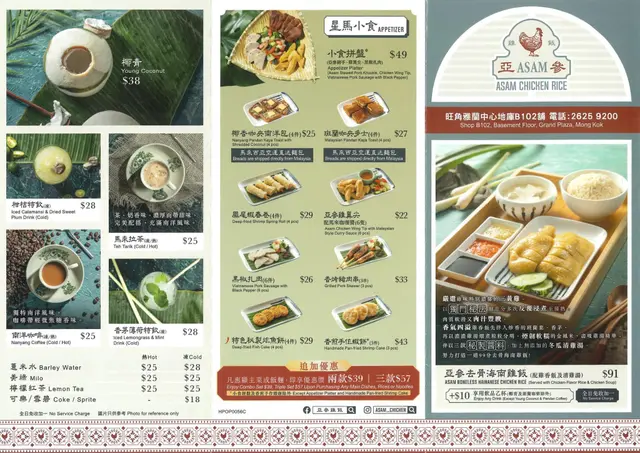 亞參雞飯 (旺角) 網址: https://s.openrice.com/QrbS0QvKA00 地址: 香港旺角彌敦道625 & 639號雅蘭中心地庫B102號舖 電話: +852 26259200