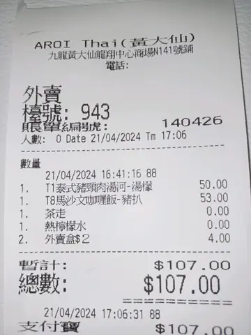 朝早去附近黃大仙拜神,我早咗到,所以去附近搵地方食早餐先,諗住食完先再去拜。喺附近行咗陣,南北館都行咗一次,諗住試吓間未食過嘅,又好似有啲特色嘅泰國餐廳,未試過喺泰國餐廳食早餐。入到去落咗單,睇到啲logo心諗似係意樂集團,應該都唔算好差嘅。點知。。。冬陰功湯,酸到好似飲緊檸檬汁咁。豬扒,可能唔知返炸咗幾多次🙈😭奶茶,以為係泰式奶茶🙈另外港式早餐,算係正正常常野。普通茶餐廳,仲要加一。食個早餐叫佢比泊車飛,態度差又唔肯比。加上冇八達通收費!…查看更多