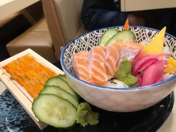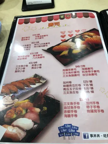 享丼丼係一間幾有特色既日式餐廳。你問我,我會覺得佢係一間日式茶餐廳,不過佢地既食物質素都唔差,價錢非常化算。魚生刺生質素呢個地段呢個價錢呢個份量算係十分好。午餐小食就奇怪左少少,有啲印度風。。。午巿係比較多優惠。我估佢意思係買三送一,四一同行一人免費。午巿有呢個自選,令我諗起車仔麵。所以先話似日式茶餐廳。呢個超值午餐係完全唔合乎邏輯地抵食。大食既朋友,一定要㨂呢個,真心無得輸。唔知佢點賺錢番黎。。。總結:午巿好選擇,一個人都唔驚,四個人黎更好,記得㨂自選,食到你反肚。