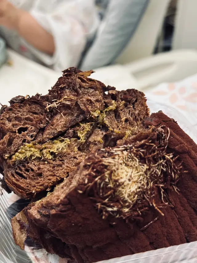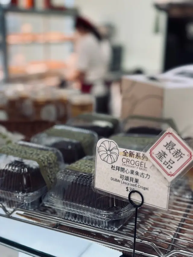 經過享樂烘焙 @ly_bakery 見到前排好hit既杜拜開心果朱古力新品喎 考慮左一秒 買左 ≖‿≖ ❙ 杜拜開心果朱古力可頌貝果 ❙ $35賣相奇特得黎充滿神秘感 原來係貝果加上唔少牛油製成既crogel氣孔比較大 彈性唔錯面頭裹上脆皮朱古力再灑上可可粉重點係內裡既牛奶朱古力夾住開心果醬 中間係好似蟲仔既小麥麵條 層次豐富呀開心果醬存在感係低 勝在唔甜(竟然!)成個包咬落脆口得黎有啲煙韌贏左口感同創意 一試無妨 ƪ(˘⌣˘)ʃ 查看更多