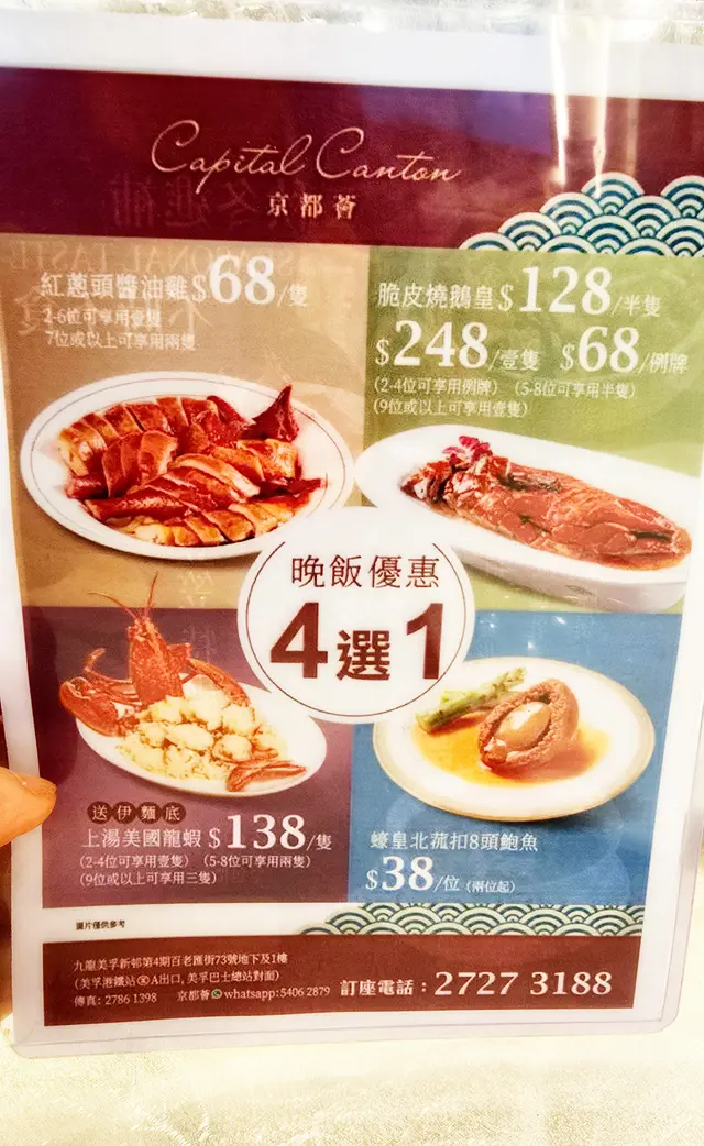 🙌🏻一間隱藏喺美孚站附近嘅老字號酒家——「京都薈」!晚市優惠勁到嚇親人,$1就食到片皮鴨/灼海生蝦/脆皮飛天雞,簡直抵到爛!.🦆首先講吓個$1片皮鴨(原價要$228㗎!),雖然係優惠價,但份量一啲都唔馬虎!店員即場係你面前片,鴨皮烤得香脆,油香十足,夾住薄薄嘅餅皮,加埋青瓜同甜麵醬,一口咬落去——正呀!14片餅皮足夠2-3人分享,記得要提早訂座,因為每日限量㗎!.🦪蒜蓉粉絲蒸大蟶子絕對係必點!四大隻蟶子足足有成隻手掌咁長,肉質鮮甜彈牙,蒜蓉香味爆棚,底下嘅粉絲吸盡蟶子精華,啖啖都係海洋嘅鮮味!.🥦西蘭花炒帶子鑊氣十足,帶子大大粒,外層微微焦香,內裡保持嫩滑,西蘭花爽脆清甜,健康又好味!.🧆話梅山楂一字骨係驚喜之作!酸酸甜甜嘅話梅山楂醬汁非常開胃,一字骨燜得軟腍入味,輕輕一咬就離骨,送飯一流!.👍🏻總括來講,京都薈作為老字號酒家,食物質素保持水準,晚市優惠性價比超高,環境乾淨舒服,服務態度唔錯,絕對係街坊飯堂之選!建議大家提早book位,因為晚市真係幾爆場㗎!…查看更多