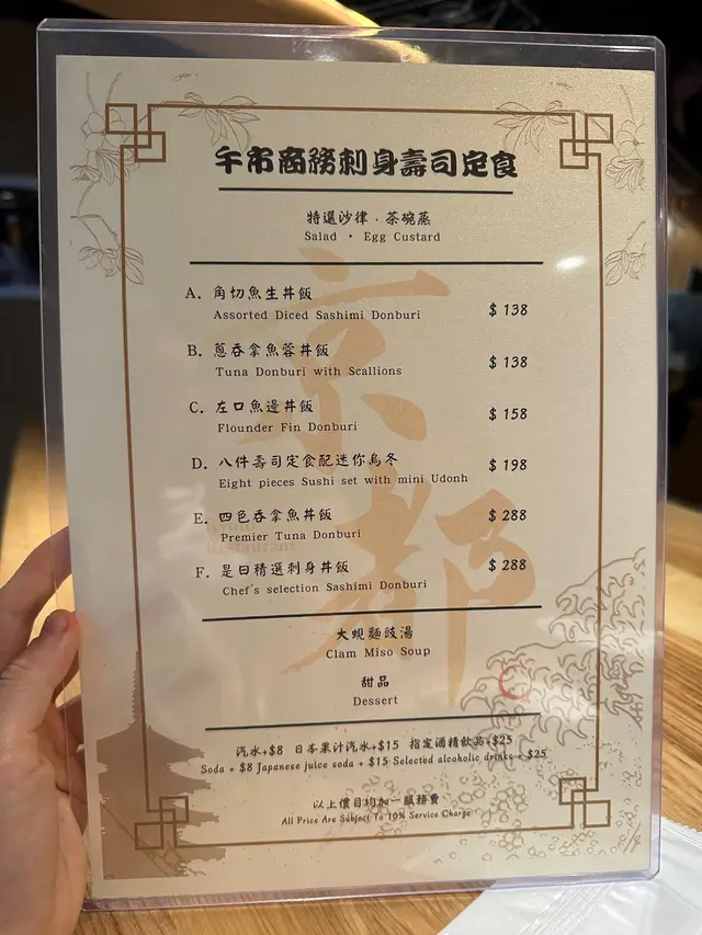 網購了一份北海道時令廚師發辦壽司一人前套餐,今天來品嚐。餐廳位於一棟酒店的樓層內,出了尖東地鐵站行去也很方便。我們在平日中午惠顧,上到餐廳未有其他客人,待應安排坐在壽司吧前面,可以看到廚師為我們做壽司。這次買的套餐是包括了六件壽司,一碗迷你角切海鮮丼和一杯飲品。廚司每做好一件壽司就放在你面前的碟上,你可以夾入口品嚐。吃完一件他才做第二件給你吃,真是可可慢慢細嚼,慢慢品味。第一件,帶子壽司,帶子非常鮮甜,一大片把壽司飯全蓋上。第二件,紅綢壽司,紅綢劃上的花紋,肉質也非常甜美。第三件,魷魚壽司,魷魚也是𠝹上花紋,一節一節的魚片,入口爽。第四件,炙燒三文魚壽司,燒過的魚肉滲出淡淡油脂香味,入口味濃郁。第五件,蟹肉壽司,一梳一梳的蟹肉附在壽司飯上,蟹肉鮮甜美味。第六件,三文魚籽壽司,粒粒魚籽都是橙紅橙紅的,晶瑩透明,入口有絲絲魚腥味,細細咬破,魚籽油在口內回甘。迷你角切海鮮丼,一小碗內包含了剛才吃過的海鮮食材,混和了青瓜粒、酸蘿蔔粒、玉子粒,細碎的蝦乾,芝麻等,吃起來口感很好,壽司飯味道鹹甜合適,這碗丼很好吃。飲品可選清酒或無酒精飲料,我們各選一款。選清酒的可自選清酒杯,很有趣。另一杯是青檸梳打,夠凍夠氣。全份套餐份量不多,吃完了我們覺得未夠飽,不過勝在全部食材都新鮮,網購價合理,體驗也是不錯。…查看更多